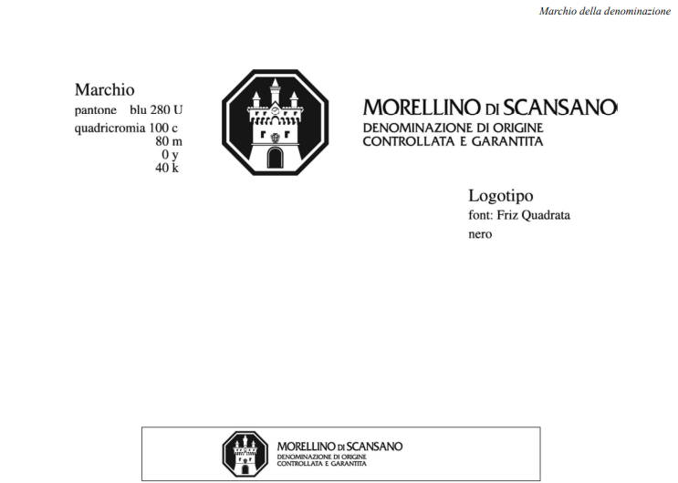 1. La denominazione di origine controllata e garantita Morellino di Scansano è contraddistinta in via esclusiva ed obbligatoria dal marchio n. 736629 (allegato n. 1) registrato dal Consorzio di tutela del vino Morellino di Scansano in data 15 dicembre 1997 nella forma grafica e letterale allegata al presente disciplinare di produzione, in abbinamento inscindibile con la denominazione Morellino di Scansano.