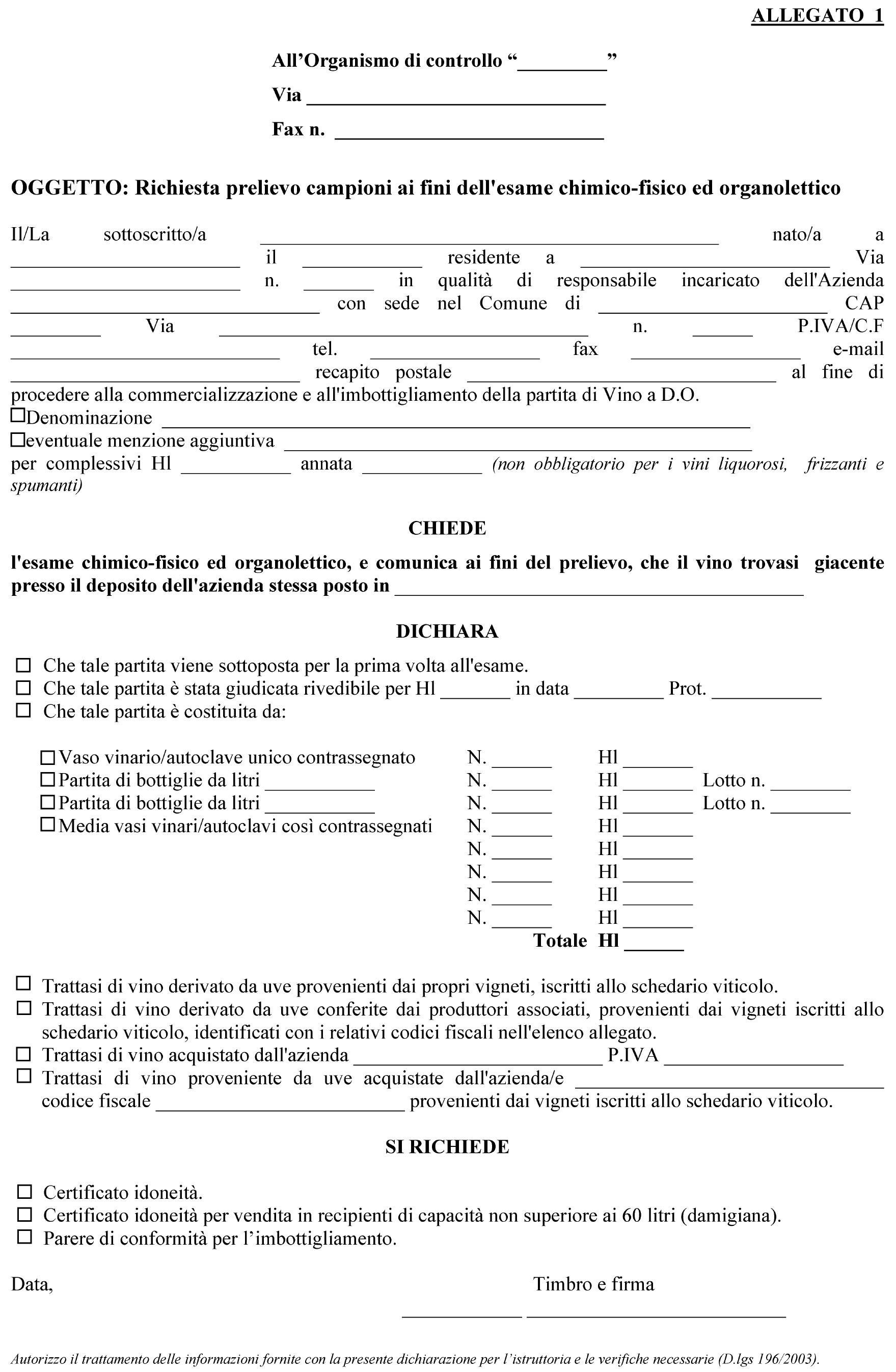 1. Il detentore di una partita di vino che intende ottenere la certificazione a DOCG o a DOC della stessa partita, presenta apposita richiesta, su modulo conforme all’allegato 1, alla struttura di controllo. La richiesta è presentata, per via informatica, o a mezzo fax, non prima che la partita abbia raggiunto le caratteristiche minime al consumo previste dal disciplinare di produzione per la relativa tipologia regolamentata. Tuttavia, fatte salve le misure più restrittive previste dagli specifici disciplinari di produzione, la predetta richiesta di prelievo può essere effettuata con un anticipo di 30 giorni rispetto alla scadenza del periodo di invecchiamento o affinamento obbligatorio previsto dagli specifici disciplinari ai fini dell’immissione al consumo della relativa tipologia di vino.