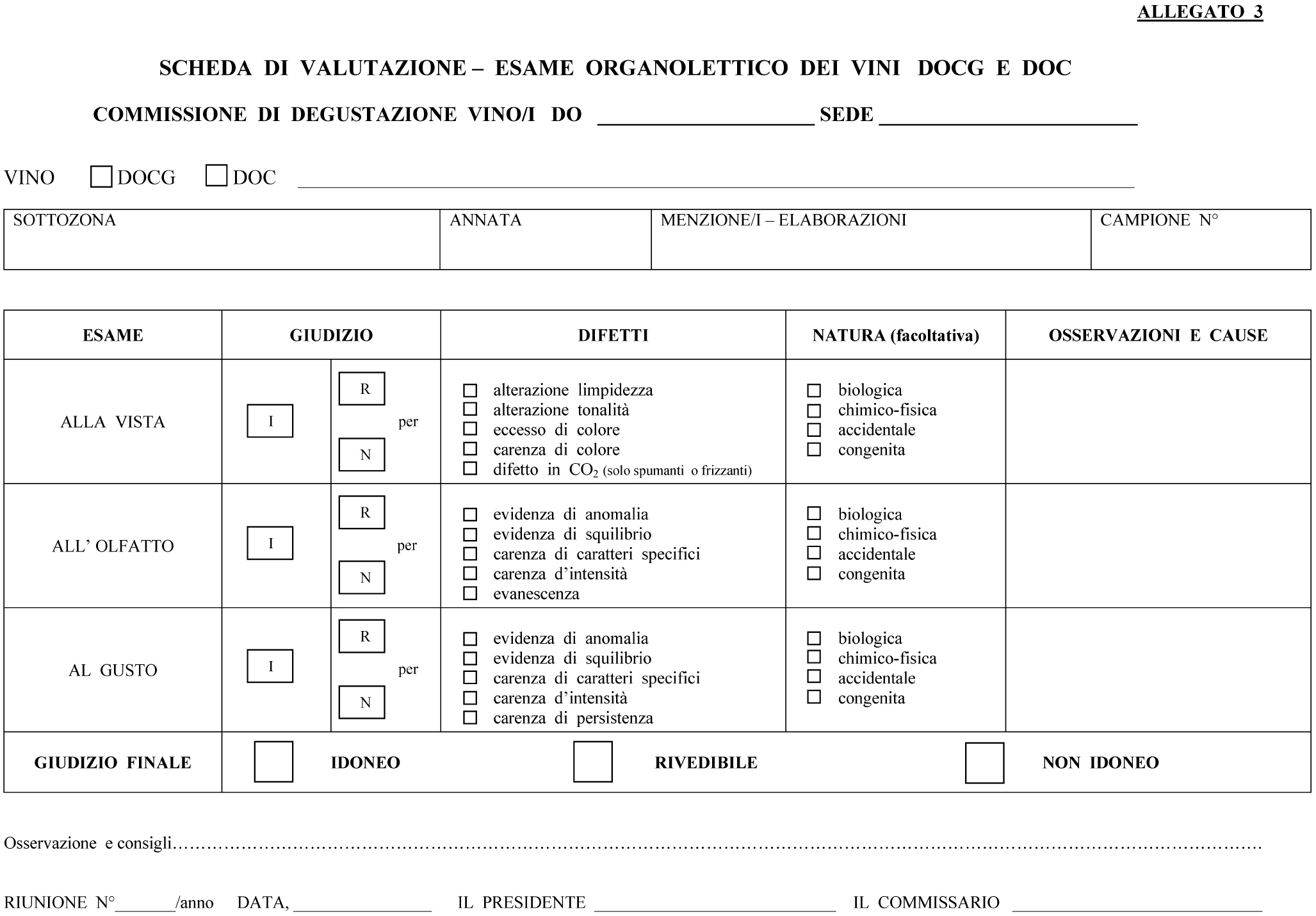 6. Per ogni campione degustato è compilata apposita scheda individuale di valutazione, secondo il modello di cui all’allegato 3 al presente decreto. Dalla scheda risulta: a) la data della riunione della commissione;