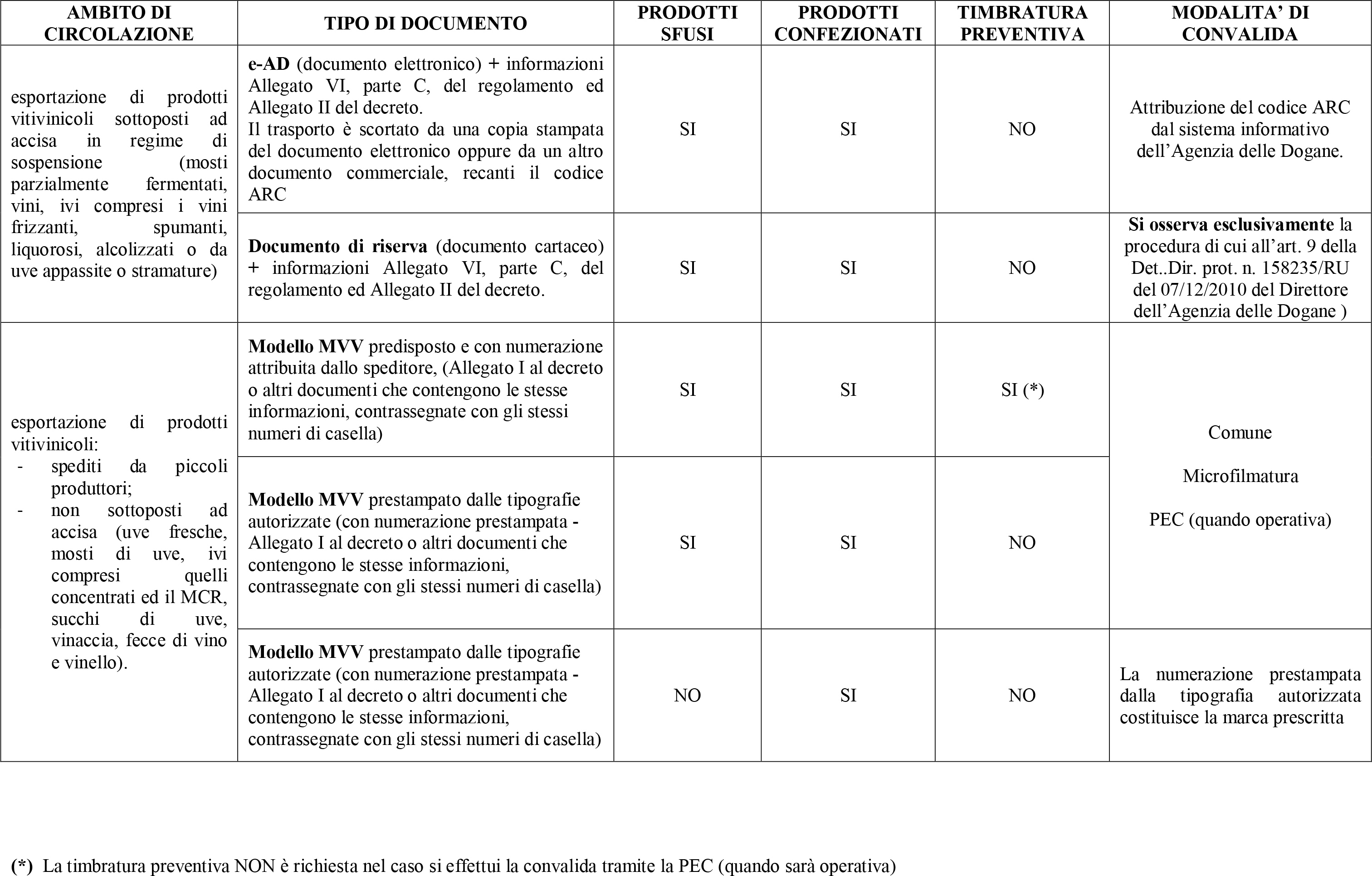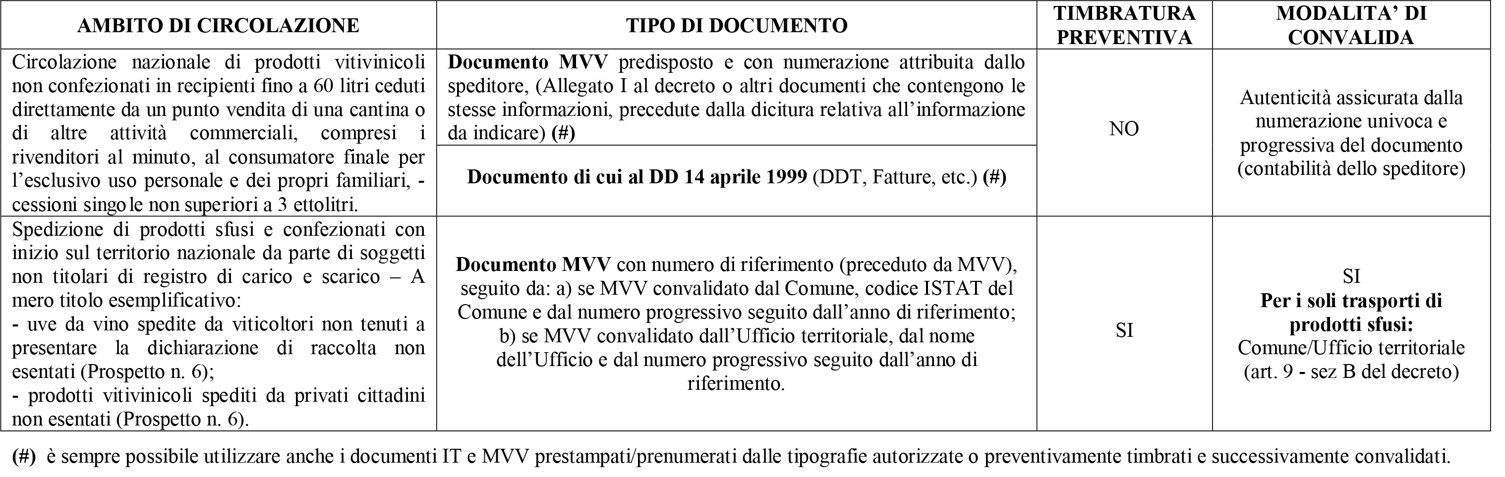  il predetto documento MVV può scortare i trasporti dei prodotti vitivinicoli sfusi e confezionati con le medesime modalità già illustrate nei casi relativi alla spedizione verso un altro Stato membro dell’Unione europea (vds. commento al Prospetto n. 1). Si specifica che per i prodotti vitivinicoli confezionati, ai sensi dell’art. 7, comma 2, del decreto, in via del tutto analoga a quanto è consentito per il “documento” di cui al decreto direttoriale del 14 aprile 1999, il predetto documento MVV, sia che si tratti di un documento predisposto dallo speditore ovvero di un documento acquistato presso una tipografia autorizzata, può non essere sottoposto né alla timbratura preventiva né alla convalida.