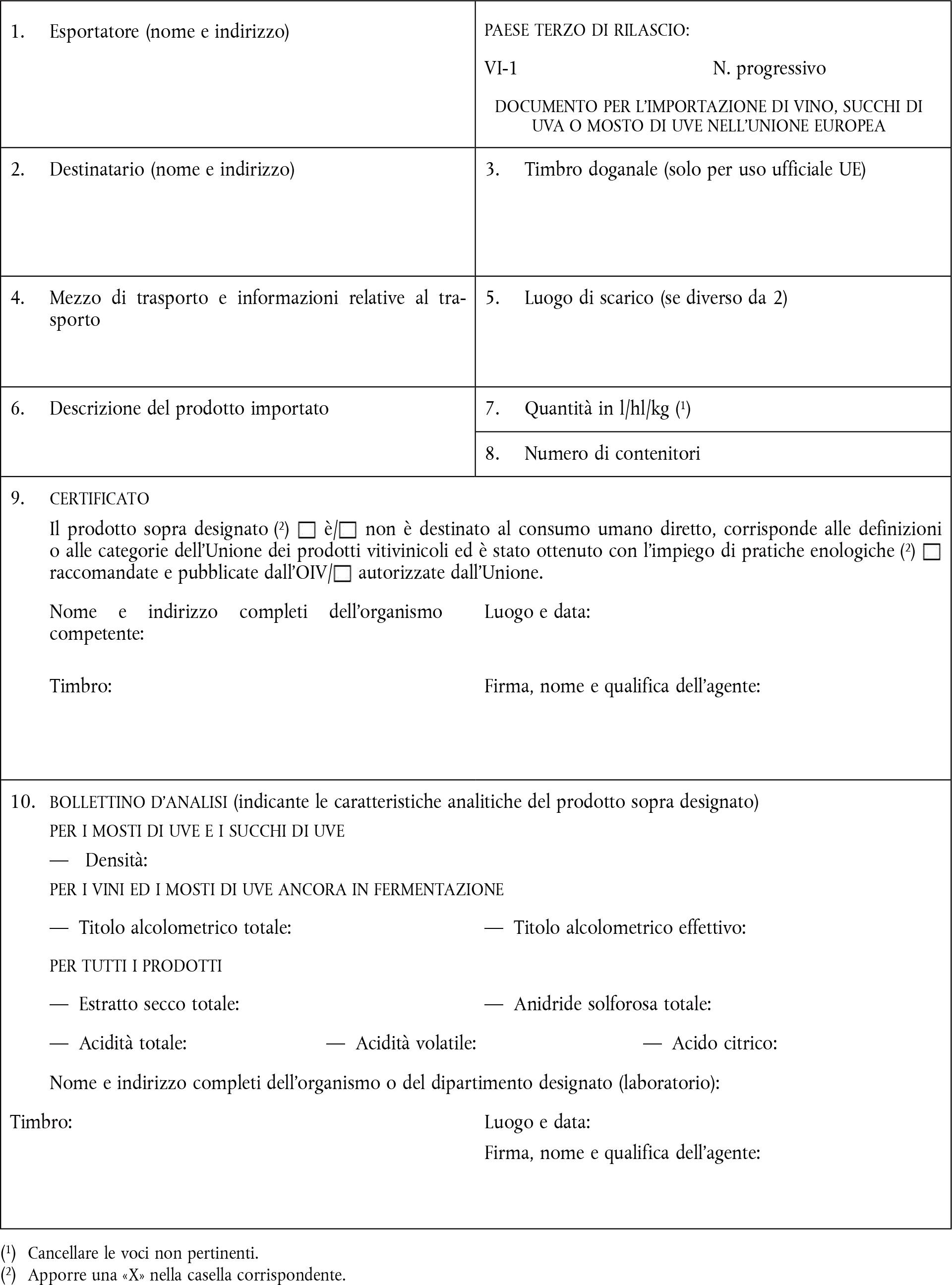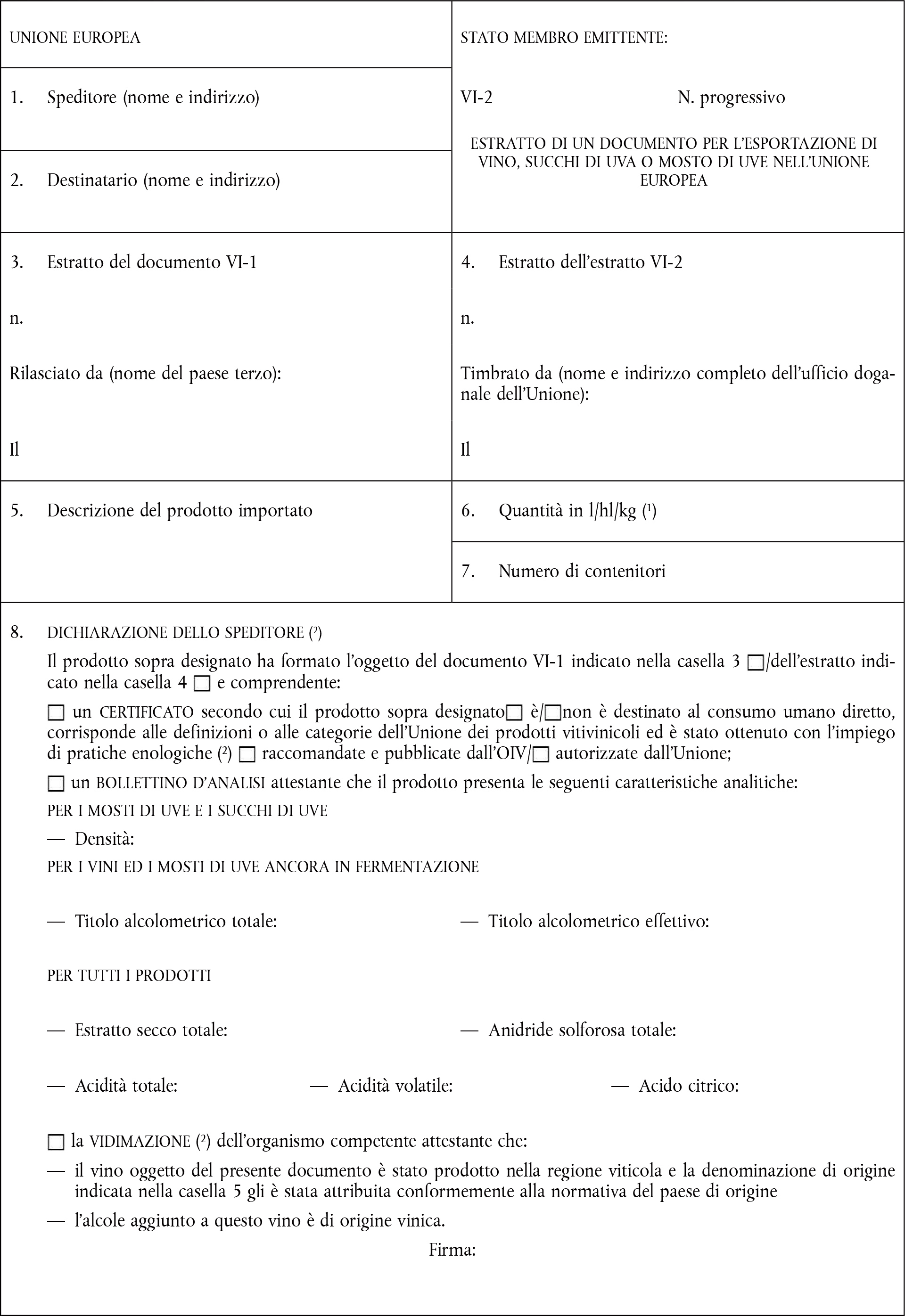 Il documento VI-1 e gli estratti VI-2 devono essere compilati a macchina o a mano o con mezzi tecnici equivalenti riconosciuti da un organismo ufficiale. Qualora sia effettuata a mano, la compilazione deve essere eseguita in inchiostro e a stampatello. I moduli non devono contenere cancellature o alterazioni. Le eventuali modifiche si effettuano depennando le indicazioni erronee e aggiungendo, ove occorra, le indicazioni volute. Ognuna di queste modifiche deve essere approvata da chi la apporta e vistata dall'organismo competente, dal laboratorio designato o dalle autorità doganali.