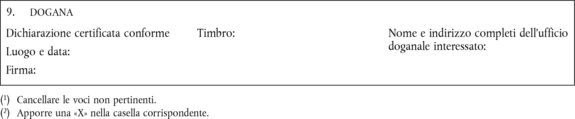 Logo dello Stato membro di spedizione e nome, indirizzo e punto di contatto dell'autorità com petente responsabile del controllo dello speditore nel luogo di spedizione. Requisiti specifici facoltativi: conferma dell'autorità di controllo che «È stato predisposto un controllo interno della qualità per garantire la conformità dei prodotti». |