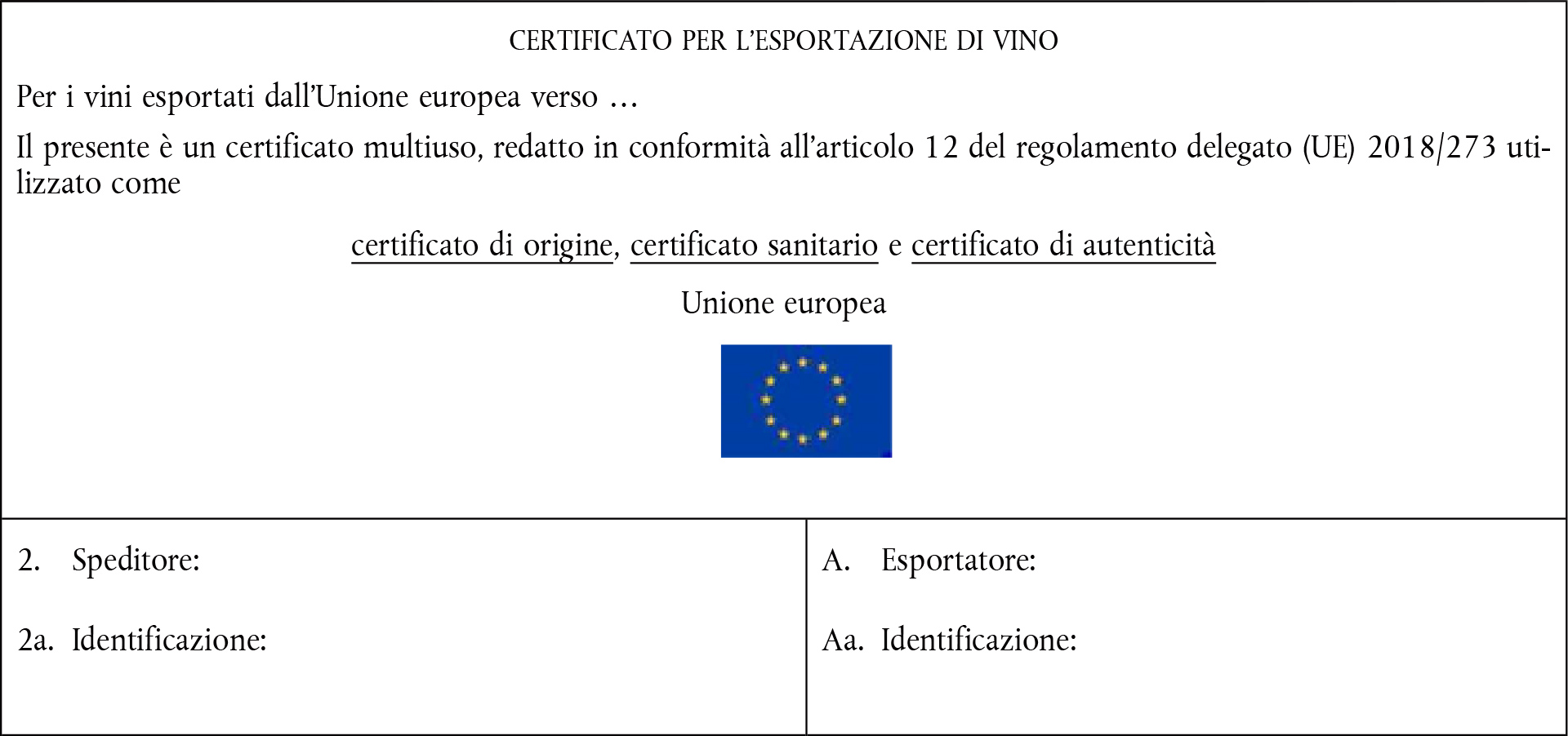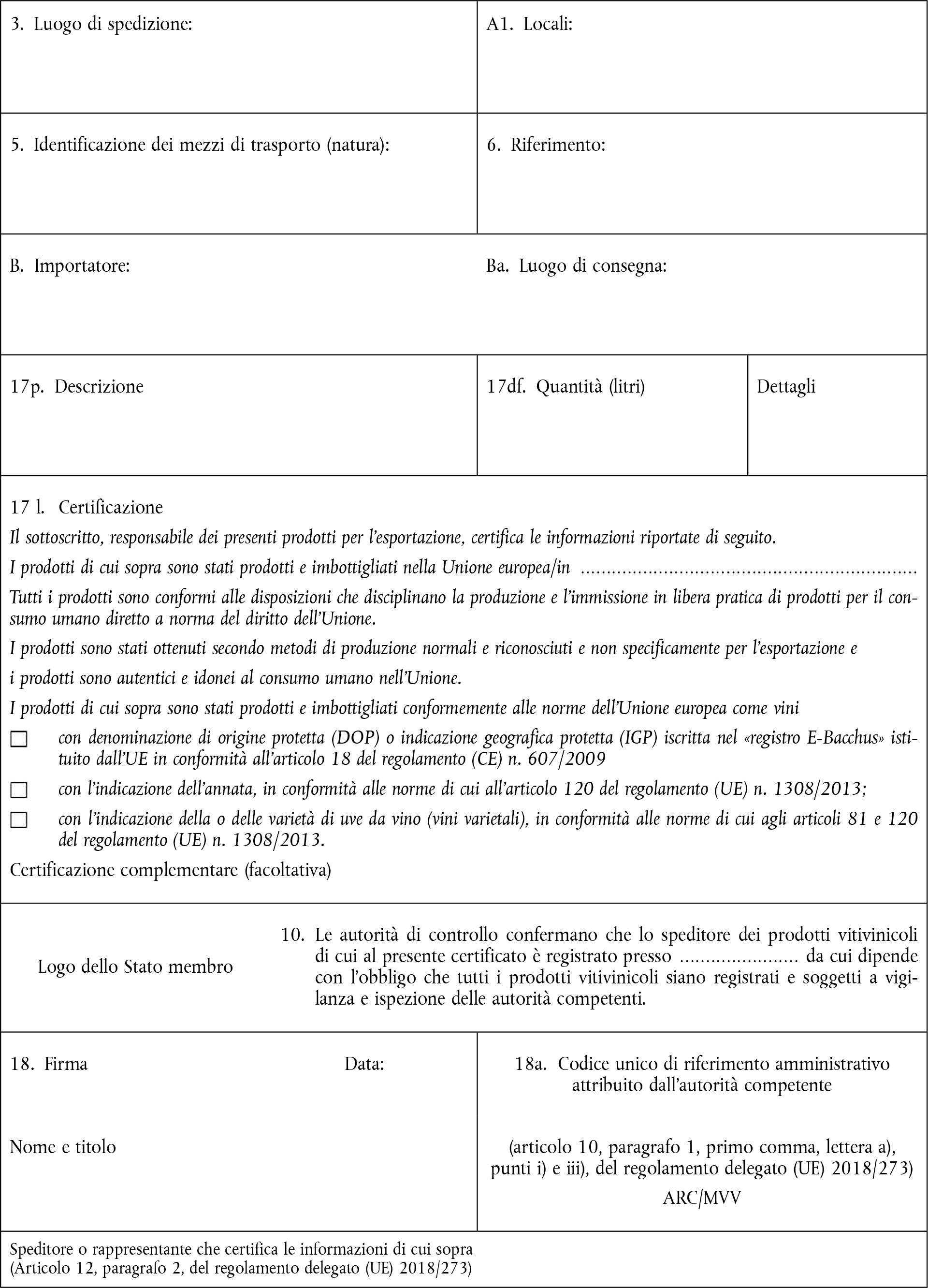Certificazione Certificazione di origine o di provenienza e conformità alle disposizioni che disciplinano la produzione e l'immissione in libera pratica di prodotti per il consumo umano diretto a norma del diritto dell'Unione e secondo i metodi di produzioni normali e approvati (pratiche enologiche, coadiuvanti tecnologici e additivi) Certificazione della DOP o dell'IGP, certificazione dell'annata o della (delle) varietà di uve da vino, conformemente alle disposizioni del regolamento (UE) n. 1308/2013. Certificazione complementare (facoltativa): può essere aggiunta dal mittente sotto forma di diciture opzionali come segue: — La mia impresa ha attuato un sistema di garanzia della qualità — La fabbricazione e la vendita dei suddetti prodotti sono autorizzate nell'UE conformemente alla legislazione UE e nazionale — I campioni dei prodotti sono selezionati in maniera casuale e sottoposti a controlli in laboratori ufficiali — Sulla base delle analisi di terzi, il livello di radioattività in termini di cesio 134 + 137 per i presenti prodotti non supera [è di] ... Bq/kg (cfr. documentazione, relazioni delle prove in allegato) — Altra certificazione |