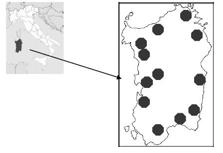 Figura 1 - Inquadramento geografico e localizzazione, in Sardegna, delle principali zone di raccolta del mirto da piante spontanee.