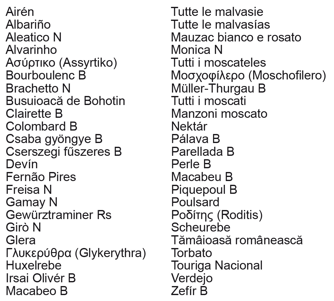 Muscats – Grenache – Garnacha Blanca – Garnacha Peluda – Listán Blanco – Listán Negro-Negramoll – Maccabéo – Malvoisies – Mavrodaphne – Assirtiko – Liatiko – Garnacha tintorera – Monastrell – Palomino – Pedro Ximénez – Albarola – Aleatico – Bosco – Cannonau – Corinto nero – Giró – Monica – Nasco – Primitivo – Vermentino – Zibibbo – Moscateles – Garnacha.