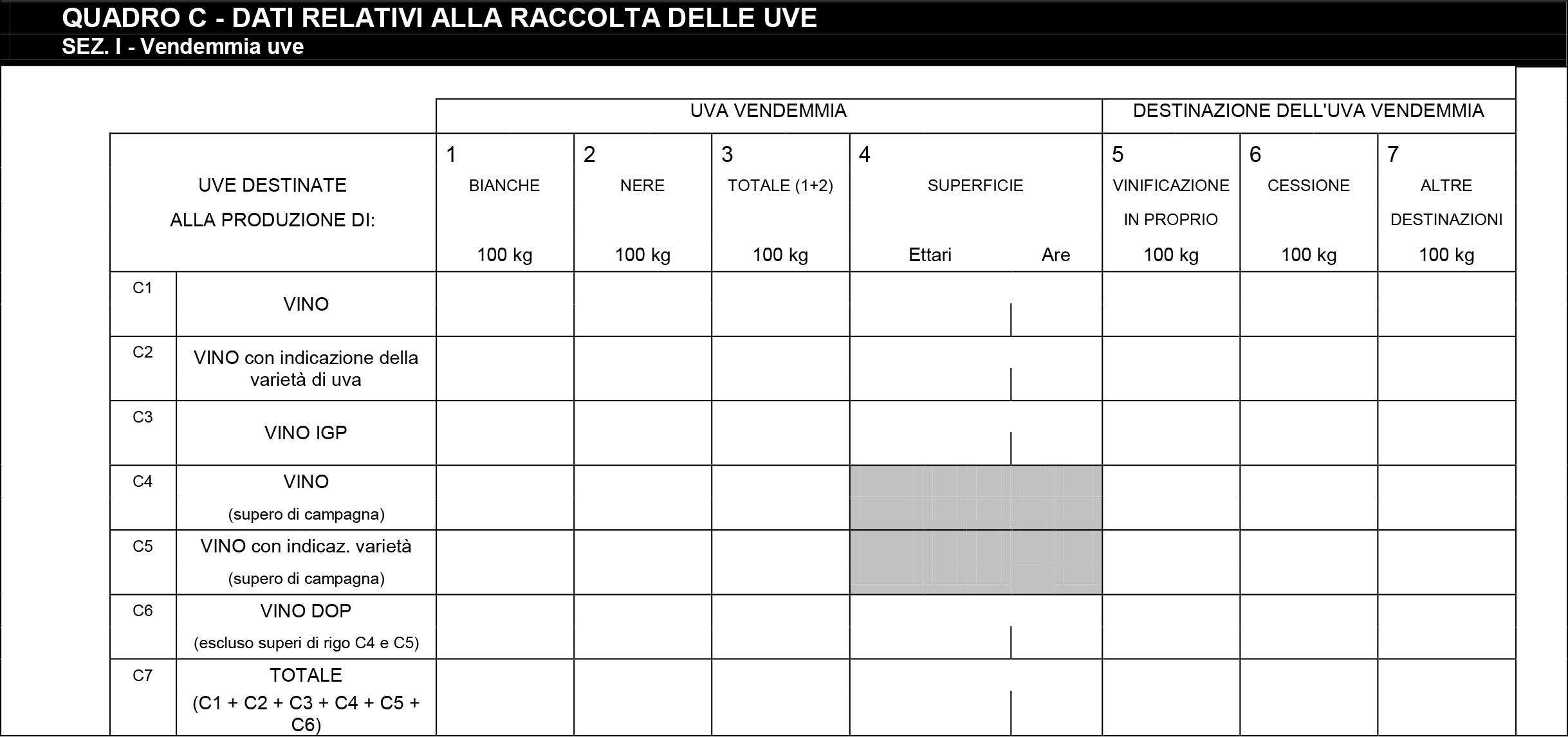 Per le modalità di compilazione si rimanda alle istruzioni per la compilazione del quadro C della dichiarazione di vendemmia delle uve.