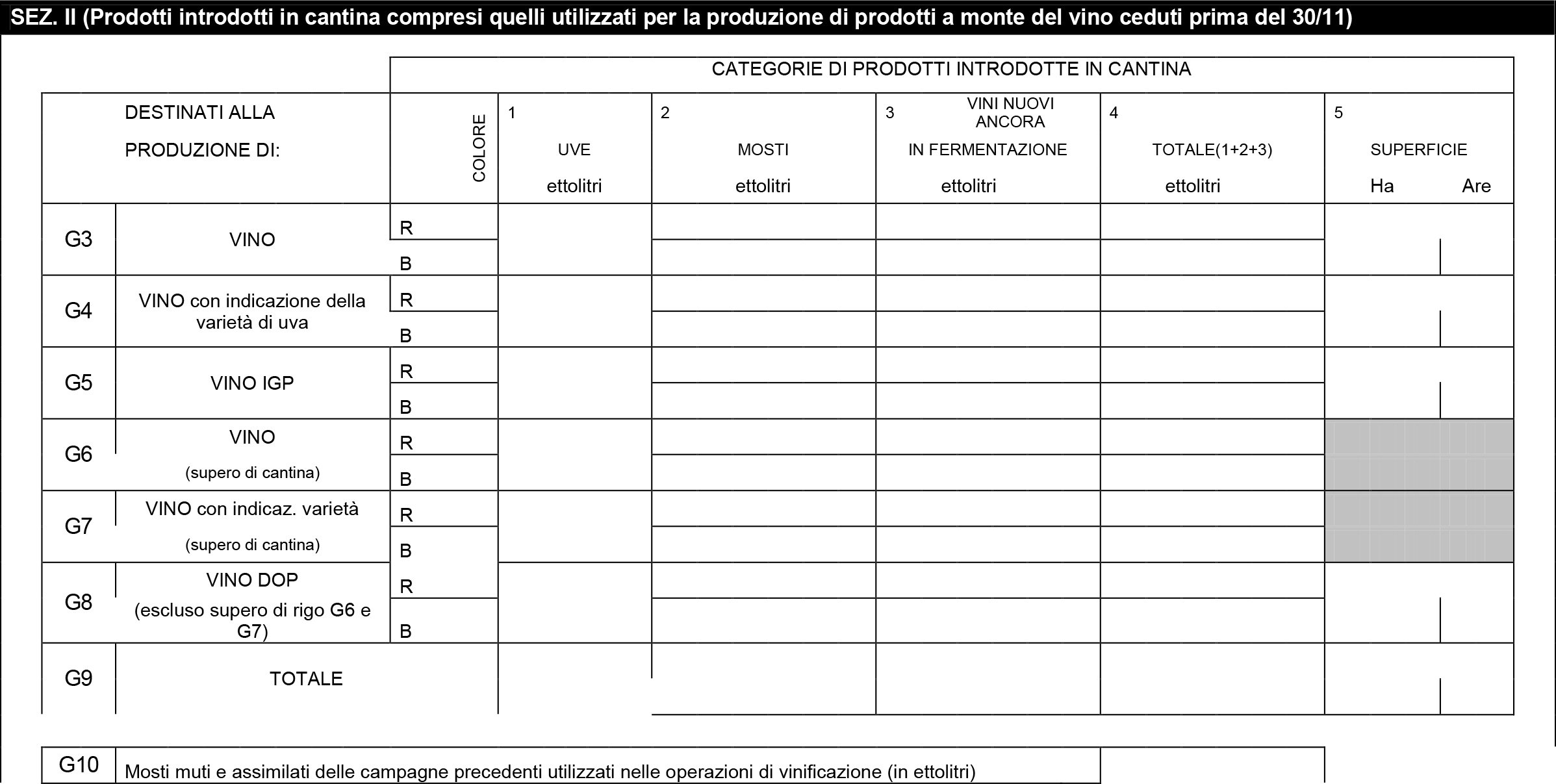 Sezione II (Prodotti introdotti in cantina compresi quelli utilizzati per la produzione di prodotti a monte del vino ceduti prima del 30 novembre).