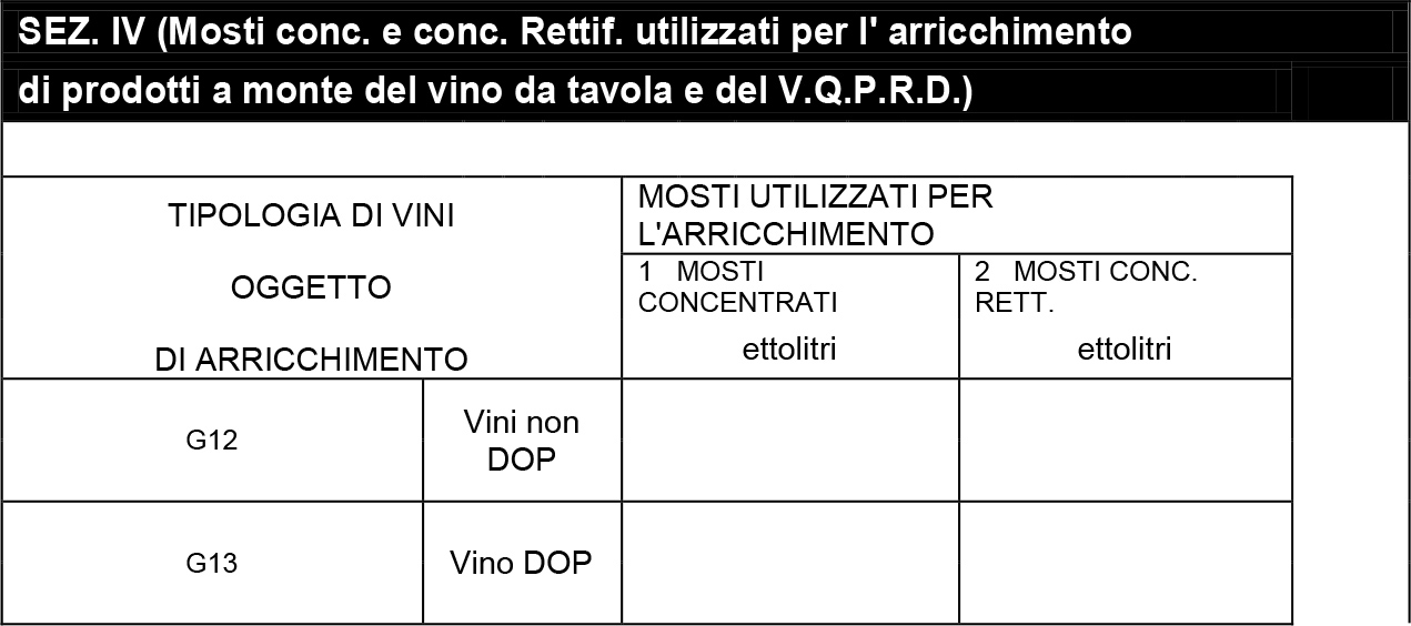 Sezione IV (Mosti concentrati e concentrati rettificati utilizzati per l'arricchimento) Riportare i quantitativi, in ettolitri di prodotto, dei mosti concentrati e concentrati rettificati utilizzati per l'arricchimento riportando nelle caselle G13-1 e G13-2 i concentrati utilizzati per i vini DOC e i vini IGT e nelle caselle G12-1 e G12-2 i concentrati utilizzati per tutte le altre tipologie.