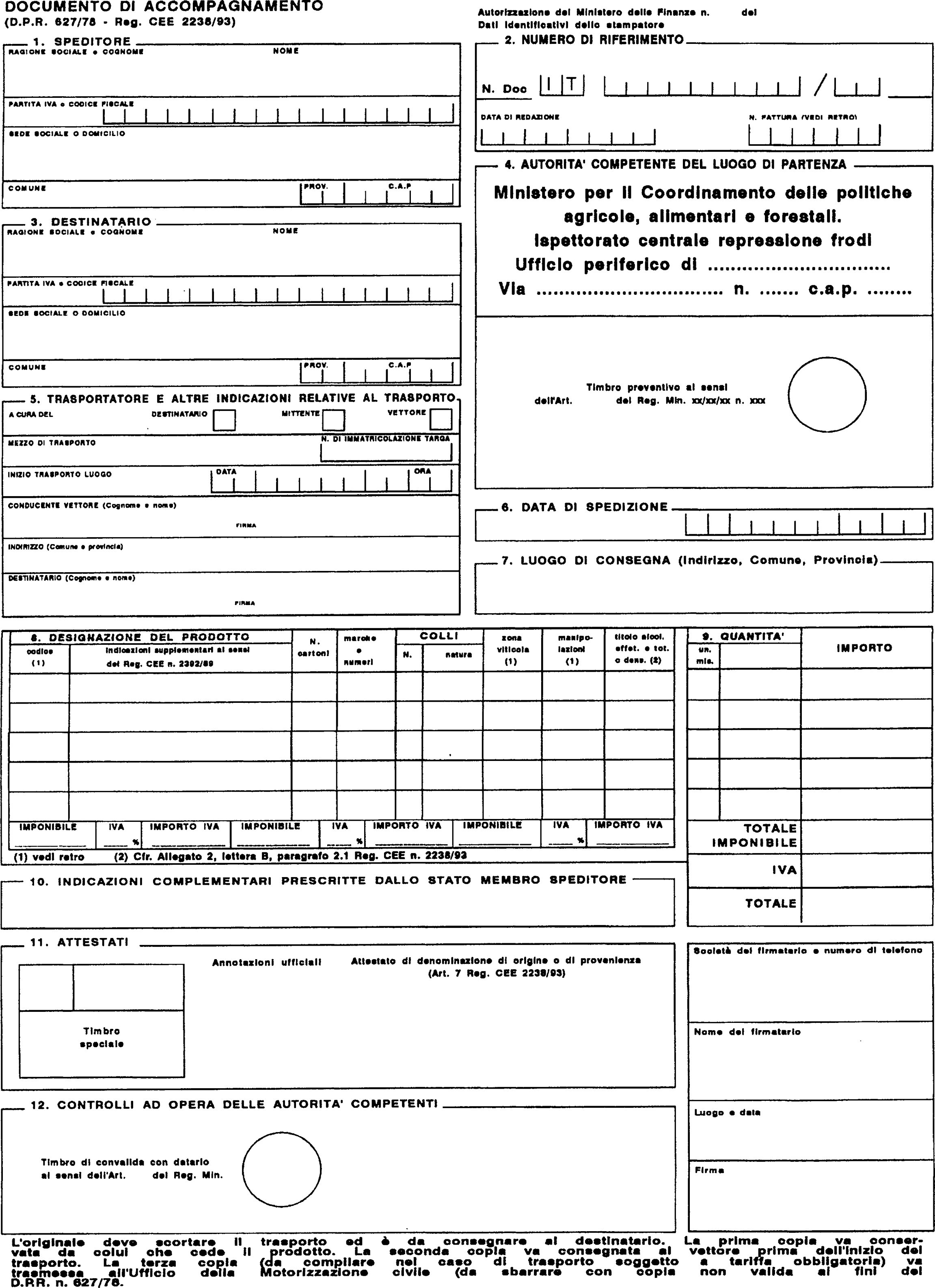 Particolari adempimenti sono posti a carico degli operatori dall’art. 10 del reg. n. 2238/93. Infatti, nel caso del trasporto di un quantitativo superiore a 60 litri di uno dei prodotti vitivinicoli non condizionati di seguito elencati, una copia del documento di accompagnamento è trasmessa dallo speditore, con i mezzi più rapidi, entro il primo giorno lavorativo successivo a quello di partenza del prodotto, all’ufficio periferico dell’Ispettorato centrale repressione frodi competente per il luogo di carico. Quest’ultimo provvederà a sua volta con i mezzi più rapidi, entro il primo giorno lavorativo successivo a quello di consegna, a trasmetterlo all’ufficio periferico dell’Ispettorato centrale repressione frodi territorialmente competente per il luogo di scarico.