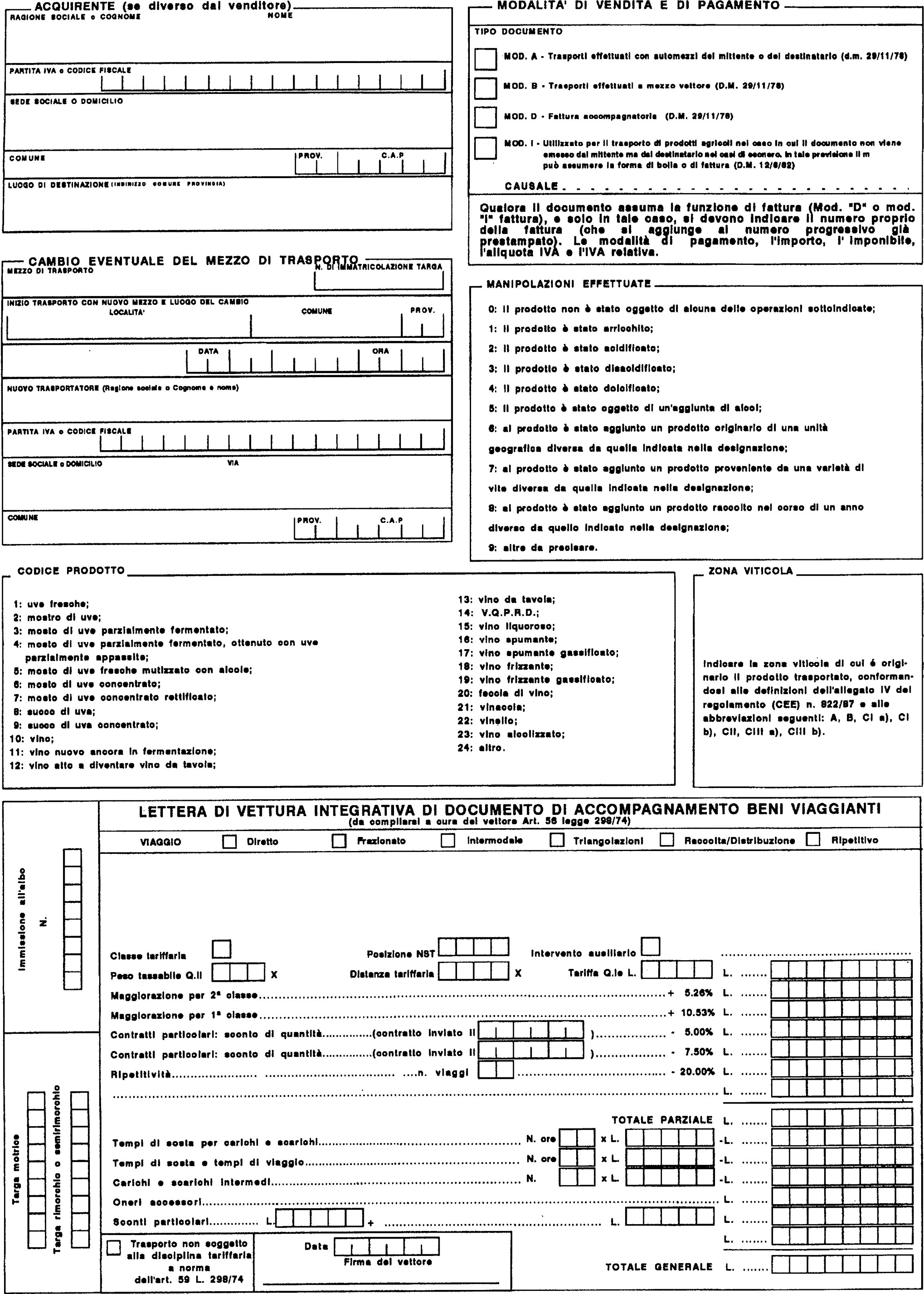 Il documento di cui sopra si identifica in una fattura o in una bolla beni viaggianti (Dpr n. 627/78), di modello conforme a quello di cui all’allegato III del reg. n. 2238/93: al riguardo, si unisce il modello predisposto in accordo con il ministero delle Finanze, che potrà senz’altro costituire uno schema valido per le tipografie autorizzate (allegato n. 2).