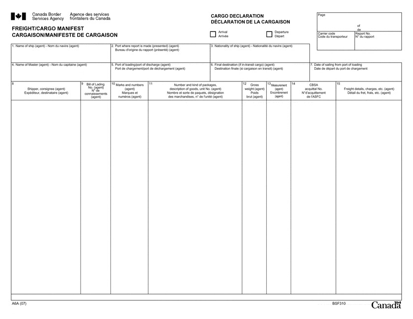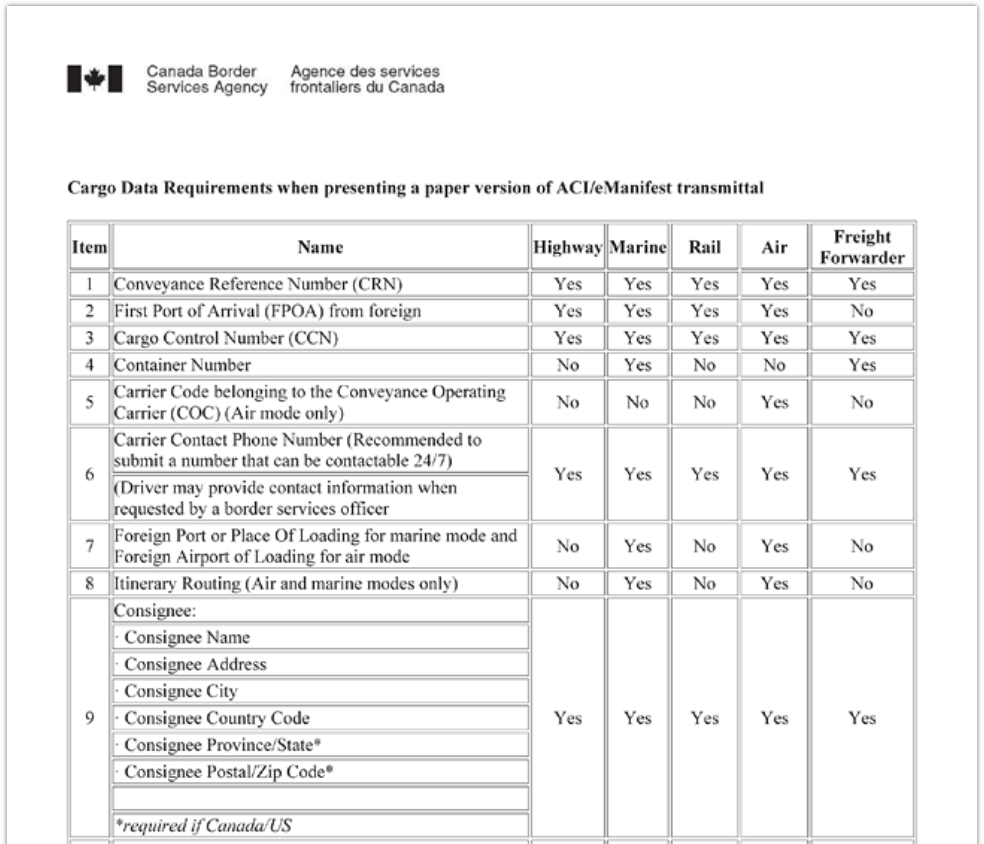 Il documento deve essere predisposto dal vettore in lingua inglese o francese. È possibile utilizzare il modulo ufficiale della CBSA oppure un modello equivalente elaborato dal dichiarante, purché contenga tutte le informazioni richieste.