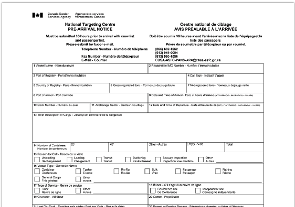 Il Pre-Arrival Notice deve essere presentato unitamente alla dichiarazione generale e all’Advance Commercial Information (ACI), ove previsto. I dati possono essere trasmessi fino a 30 giorni prima dell’arrivo della nave, ma non oltre le 96 ore antecedenti l’ingresso previsto in Canada.