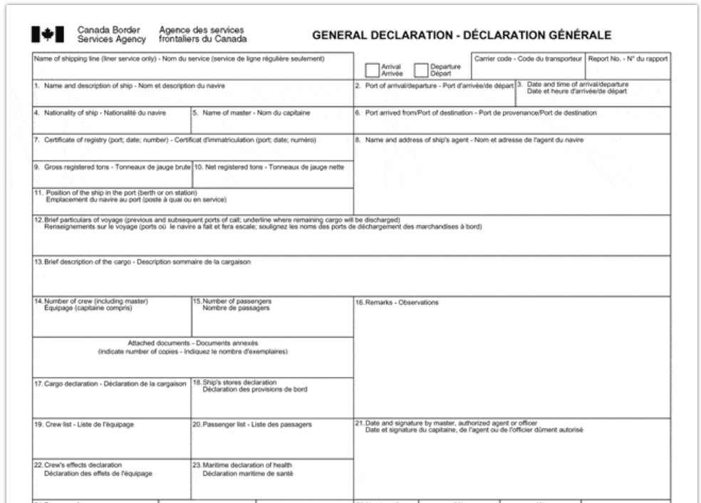 La General Declaration for Vessels è il documento attraverso il quale il vettore marittimo comunica alle autorità doganali canadesi i dati identificativi della nave e le informazioni relative al carico trasportato. Tale adempimento è richiesto nell’ambito delle procedure di sorveglianza doganale.