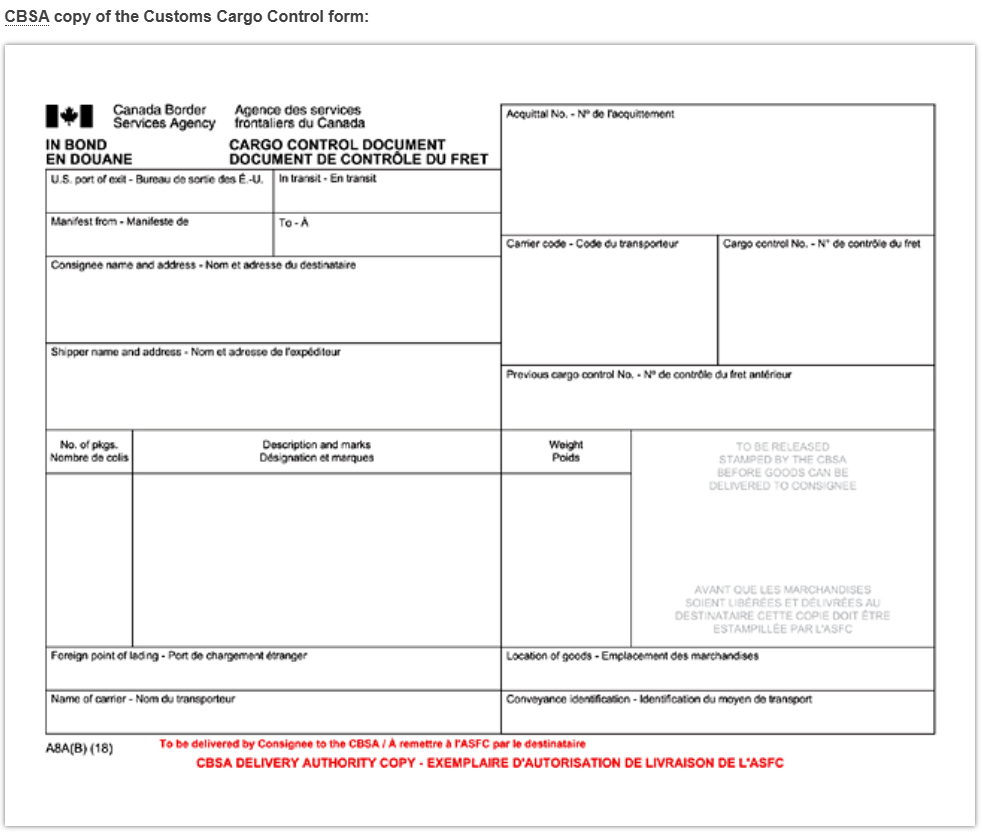 Il Customs Cargo Control è il documento con cui si fornisce alle autorità doganali canadesi un riepilogo di tutte le merci presentate in dogana. Esso serve a registrare formalmente l’arrivo della spedizione e viene inoltre utilizzato per tutte le merci movimentate in-bond verso un ufficio doganale interno, un sufferance warehouse o un bonded warehouse.