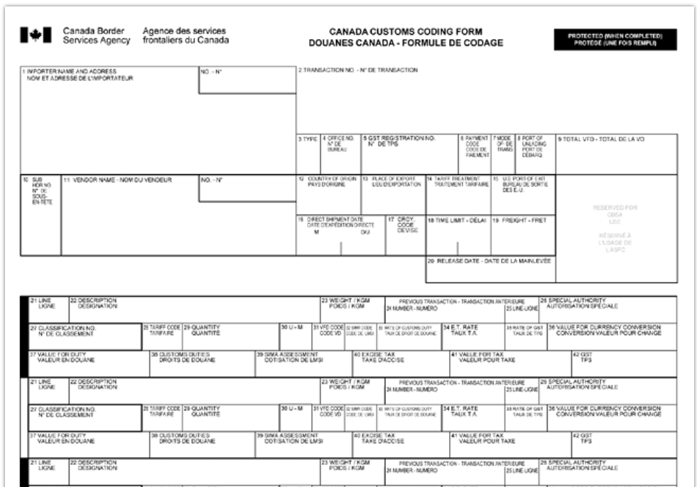 La presentazione del documento è obbligatoria ai fini dello sdoganamento quando il valore FOB delle merci supera 2.500 CAD, oppure quando le merci beneficiano di un ingresso esente da dazio senza condizioni indipendentemente dal prezzo di vendita, e la Commercial Invoice non contiene tutte le informazioni richieste.