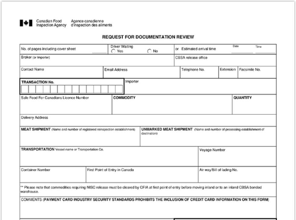 Documento mediante il quale l’importatore richiede l’approvazione della Canadian Food Inspection Agency (CFIA) per il rilascio delle merci in dogana.