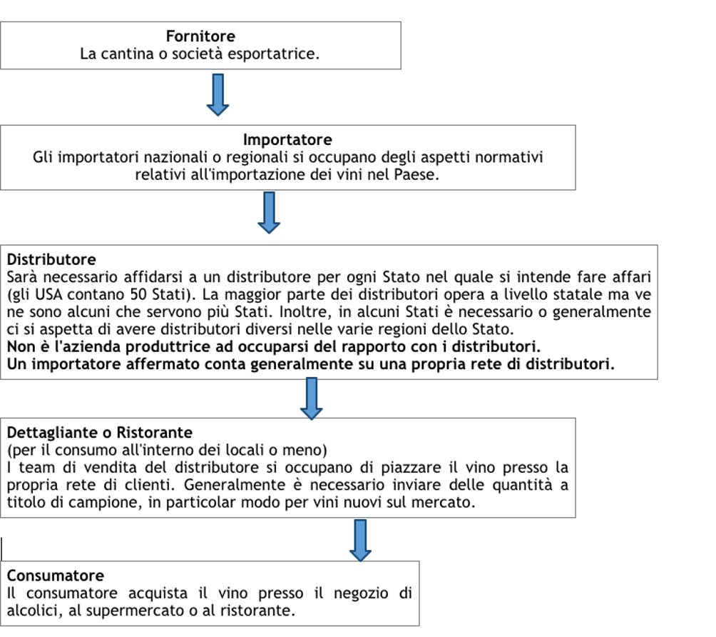 Le vendite di vino negli USA prevedono un complesso sistema composto da 3 livelli, ovvero: l'importatore/grossista, il distributore e il dettagliante. Per far arrivare i nostri vini al consumatore, sarà necessario attraversare questa filiera