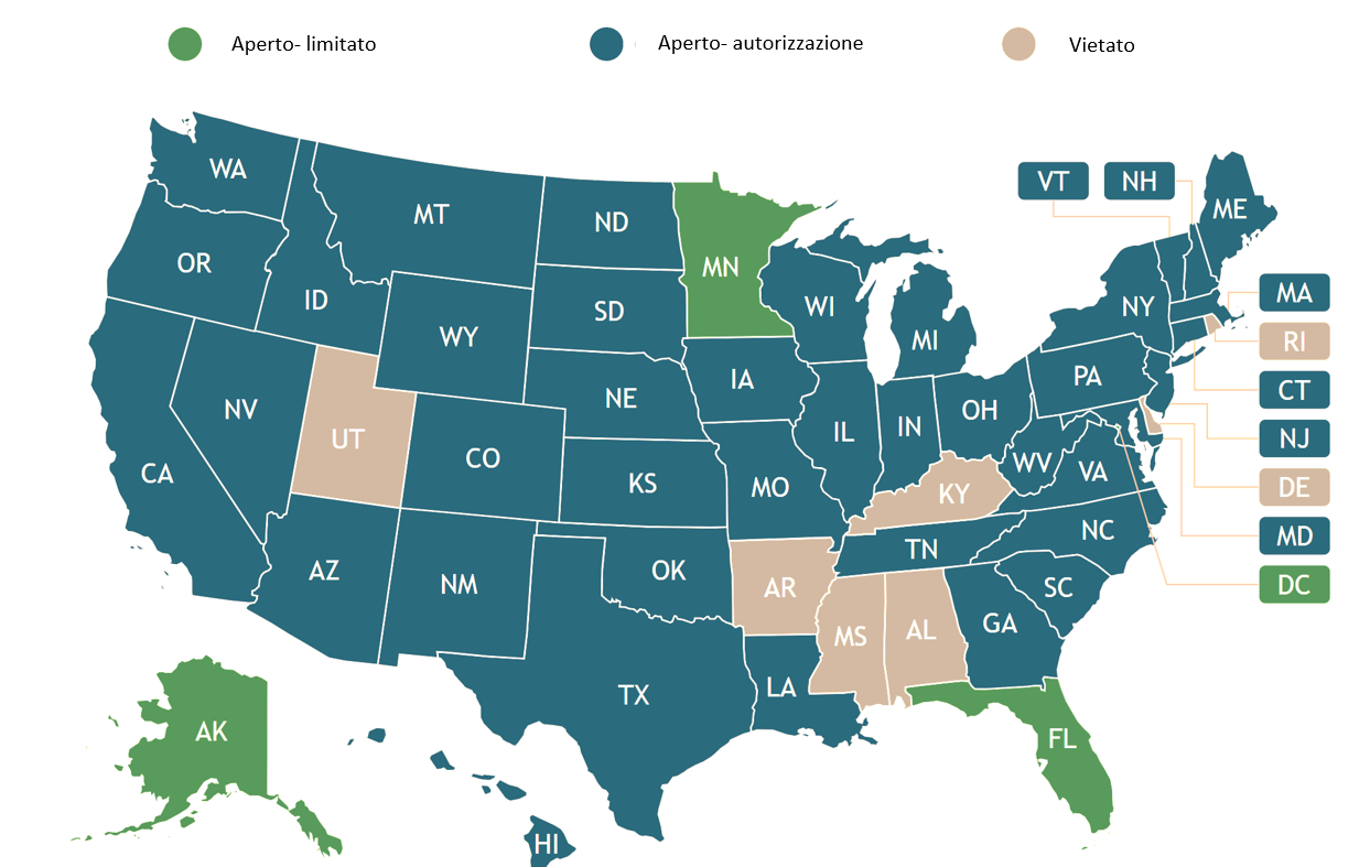 Permesso aperto: Stati che hanno approvato una legislazione che consente alle cantine di spedire ai consumatori a condizione che l'azienda sia conforme a tutti i requisiti di licenza e di segnalazione. Le disposizioni comuni di queste leggi sono: