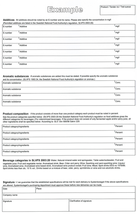A seguire un esempio di Certificato di prodotto Systembolaget.