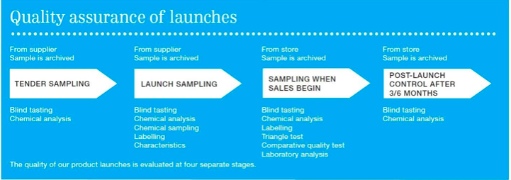Le procedure di acquisto presso il Systembolaget prevedono l’accesso al mercato sia ai piccoli che ai grandi fornitori. I bandi di gara sono preparati sulla base di un piano di lancio, specificando il tipo di prodotti, l’origine e il prezzo richiesti. Tutti i prodotti devono essere trasmessi al Systembolaget, che procede a giudicarli mediante una degustazione alla cieca attribuendo un punteggio da 1 a 9 (in cui 1 è assegnato a prodotti che presentano difetti e 9 sta a significare che il prodotto è eccellente). Il Systembolaget procederà ad acquistare i vini con il punteggio medio più alto. I prodotti prescelti verranno poi analizzati presso i laboratori Systembolaget. L’infografica riportata sotto illustra il sistema di garanzia di qualità per i nuovi prodotti introdotti nel listino Systembolaget.