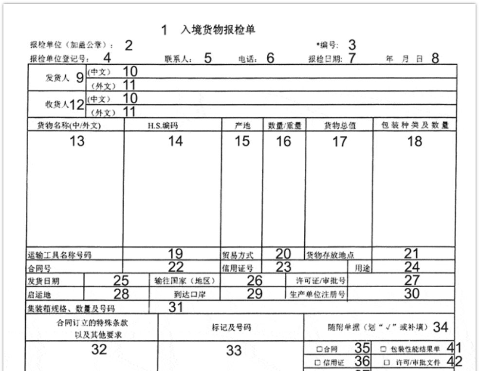 Il nome cinese del documento è 入境货物报检单 (Ru Jing Huo Wu Bao Jian Dan).