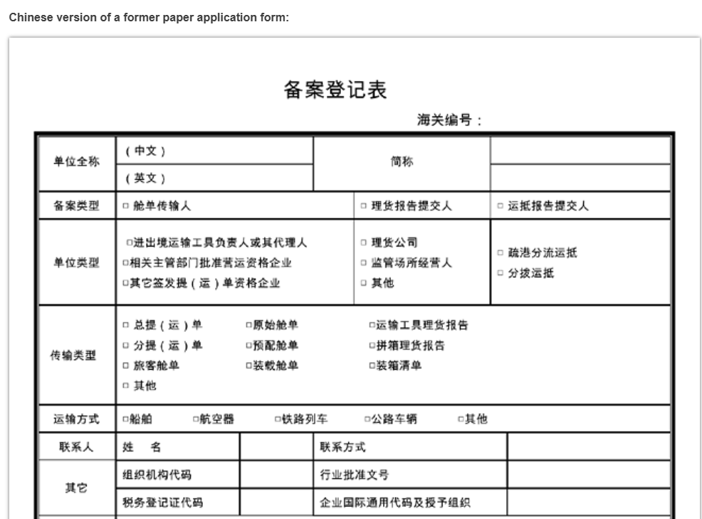 La domanda deve essere trasmessa in modalità elettronica tramite lo Sportello Unico per il Commercio Internazionale della Repubblica Popolare Cinese, accessibile all’indirizzo www.singlewindow.cn, e deve essere compilata in lingua cinese (si veda, a titolo esemplificativo, il fac-simile in inglese del precedente modulo cartaceo).