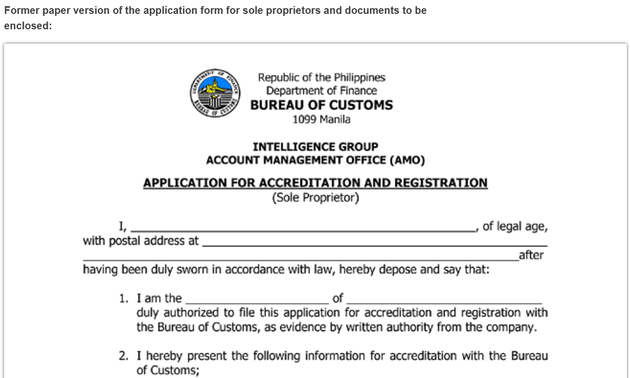 Documento che attesta che un importatore è stato accreditato e registrato presso il Bureau of Customs (BOC) delle Filippine. Tale accreditamento è indispensabile per ottenere lo sdoganamento delle merci ed è inoltre un requisito preliminare per la registrazione al Client Profile Registration System (CPRS), collegato all’assegnazione del Customs Client Number.
