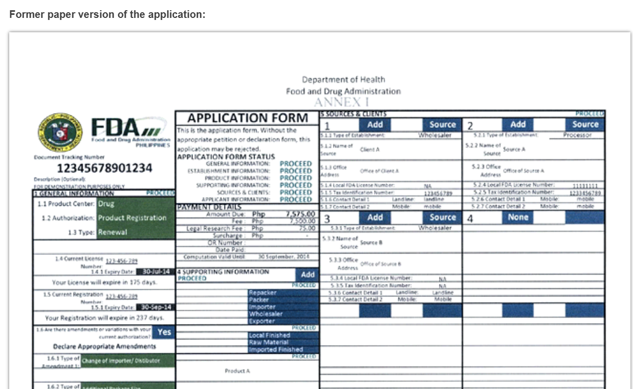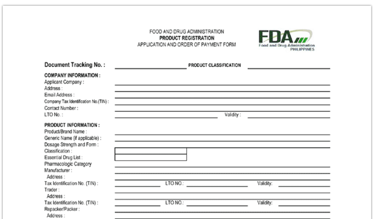 Il modulo di domanda deve essere compilato in inglese ed inviato elettronicamente tramite il sito Web della FDA. È richiesta una precedente registrazione dell'utente. La domanda deve essere presentata almeno un mese prima della data prevista di arrivo e la tassa di elaborazione è stabilita dall'autorità e varia a seconda del periodo di validità scelto. Il certificato iniziale di registrazione del prodotto è valido per due o cinque anni. Un successivo rinnovo della registrazione sarà valido per tre anni.