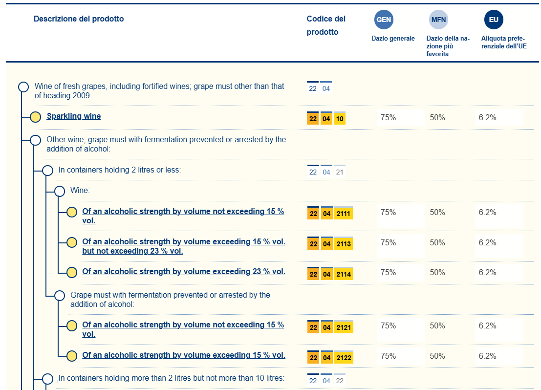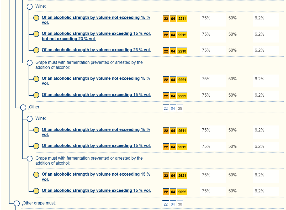 I liquori con un titolo alcolometrico volumico effettivo pari o superiore a 20% vol sono soggetti a un'aliquota di imposta speciale sul consumo pari al 65% del valore pagato, mentre un'aliquota del 35% del valore pagato รจ applicata a quelli con un titolo alcolometrico volumico effettivo inferiore a 20% vol.
