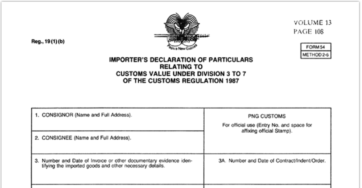 La Dichiarazione Doganale di Importazione (Customs Import Declaration) costituisce il modello ufficiale previsto per lo sdoganamento delle merci. Essa è obbligatoria per tutte le operazioni di importazione che riguardino beni di valore superiore a 1.000 PGK.