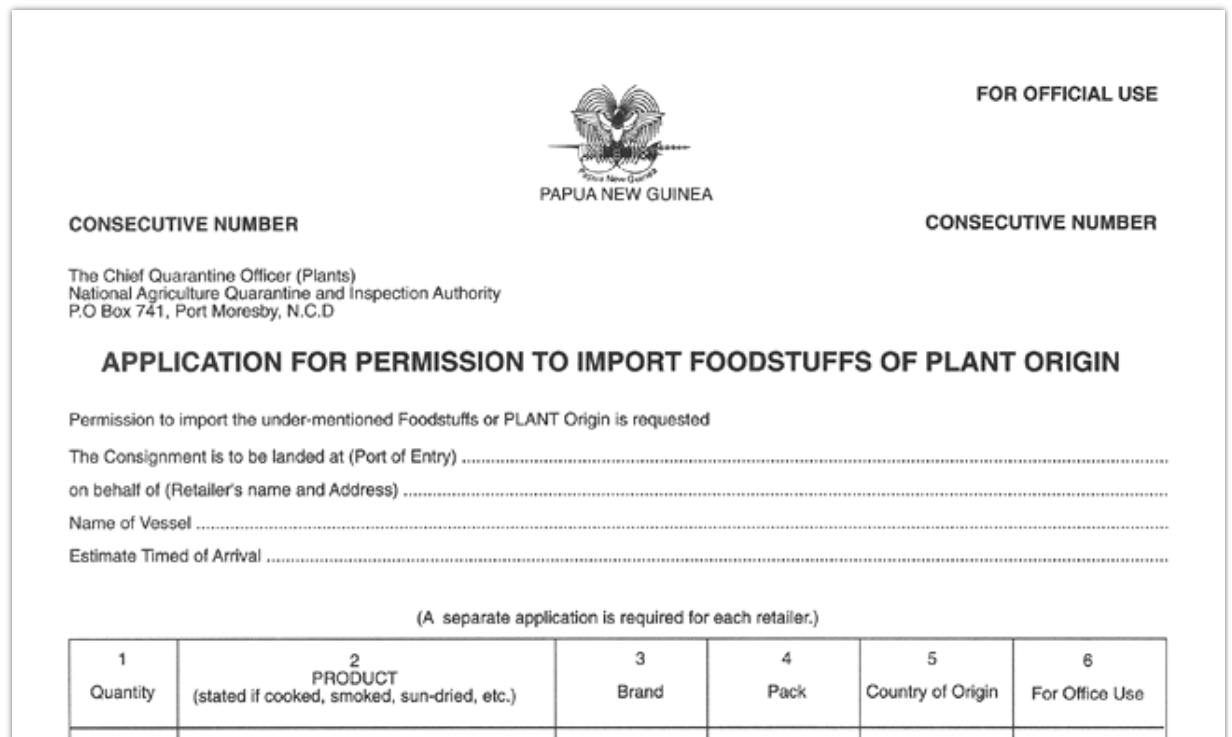 Non è previsto un modulo cartaceo specifico. La domanda deve essere compilata in lingua inglese e inviata elettronicamente tramite la piattaforma https://naqia.gov.pg/login, da quattro a sei settimane prima della spedizione dal porto di origine. Per l’invio elettronico è necessario essere registrati come importatore, tramite un account utente.