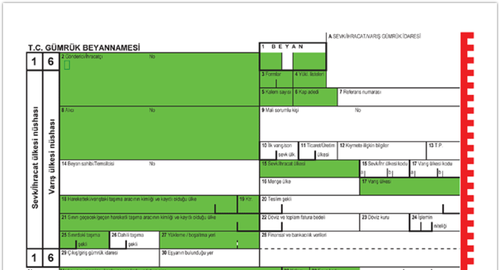 Il modello turco della Dichiarazione di Importazione è conforme al Documento Amministrativo Unico europeo (Single Administrative Document, SAD). I dati per la dichiarazione devono essere generalmente trasmessi elettronicamente tramite l’interfaccia BILGE, previa registrazione al sistema, oppure tramite un software doganale compatibile con BILGE. Contestualmente, è richiesto di presentare una stampa della dichiarazione elettronica presso l’ufficio doganale di importazione.
