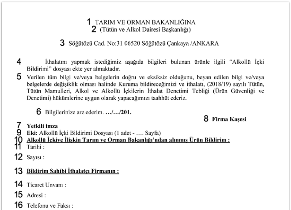 La Notifica per Bevande Alcoliche è un documento mediante il quale l’importatore informa l’Autorità Regolatoria per Tabacco, Prodotti del Tabacco e Bevande Alcoliche della propria intenzione di immettere sul mercato bevande alcoliche. Tale documento è necessario per l’accesso al mercato. In turco, il documento è denominato Alkollü içki bildirimi.