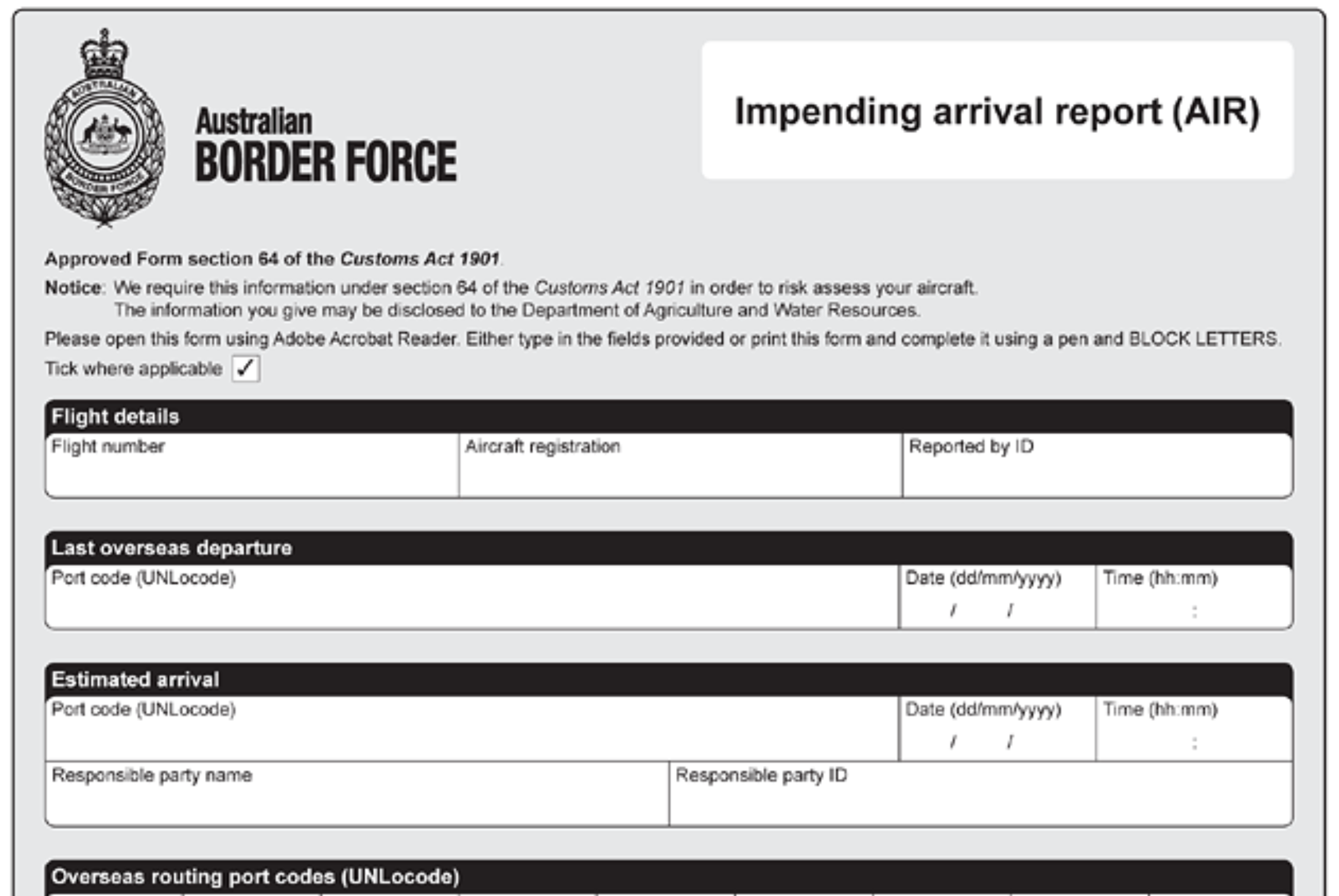 Documento che fornisce alle autorità doganali australiane i dettagli relativi all'effettivo arrivo dell'aeromobile. Questo rapporto è l'ultimo documento da presentare per la segnalazione del trasporto aereo di merci.