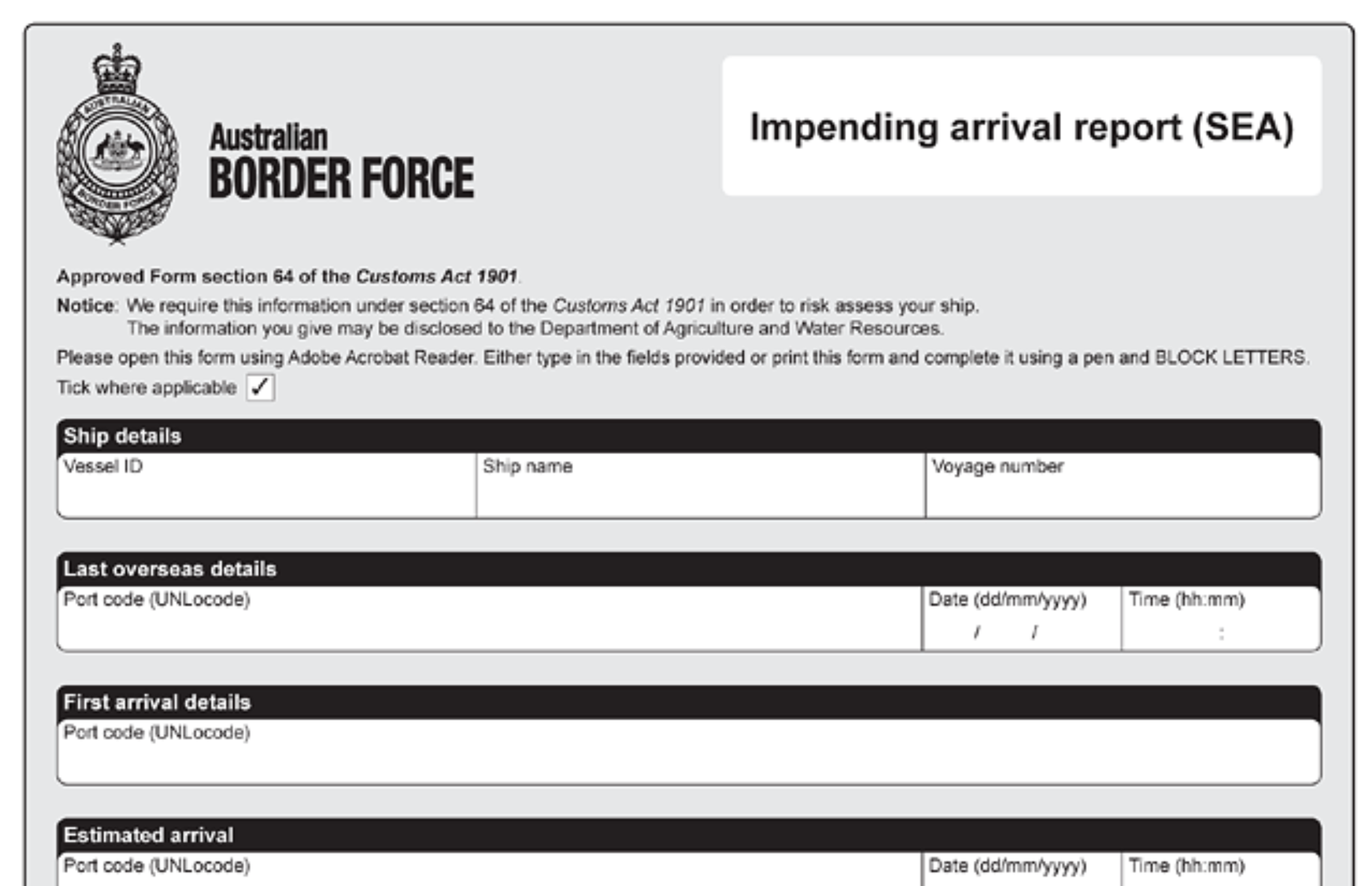 Documento che notifica al Dipartimento dell'Agricoltura, della Pesca e delle Foreste l'arrivo di una nave in Australia. Il documento è necessario per le navi di lunghezza complessiva pari o superiore a 25 metri che arrivano in Australia dall'estero o che sono state in contatto con navi o impianti marittimi stranieri.