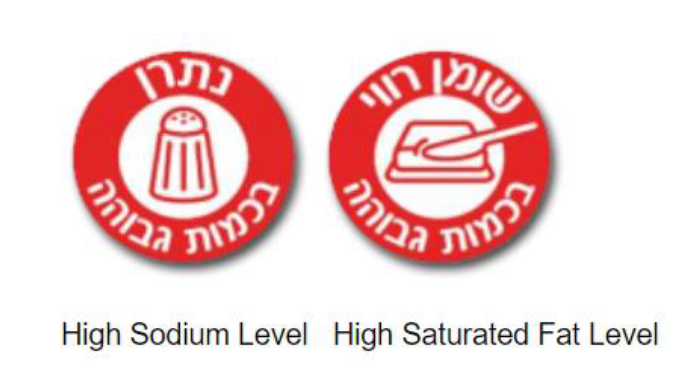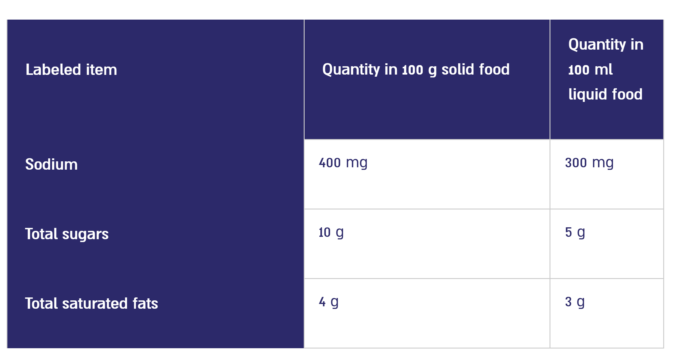 I prodotti considerati essere ad alto contenuto di sodio, zucchero e grassi saturi devono essere contrassegnati con un simbolo rosso sulla parte anteriore della confezione. Gli importatori possono applicare adesivi sui prodotti di fabbricazione estera per rispettare il regolamento.