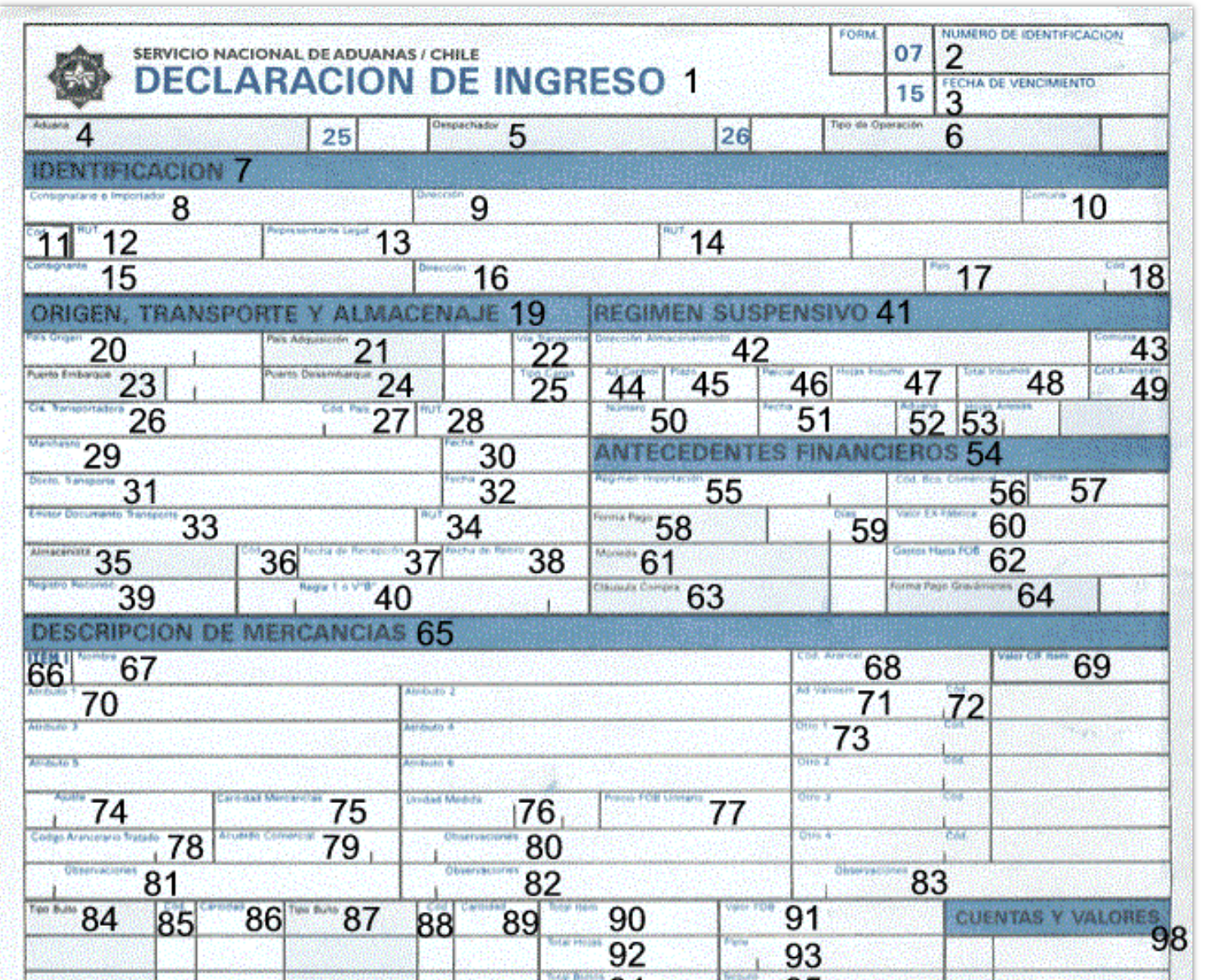 Richiesto per lo sdoganamento. Il documento è un prerequisito. L'autorità responsabile è il Servizio doganale nazionale = Servicio Nacional de Aduanas (SNA), Plaza Sotomayor 60, Casilla 1720, CL-Valparaíso, numeri di telefono: +56 32 2134505, 2134529, sito web: https://www.aduana.cl.