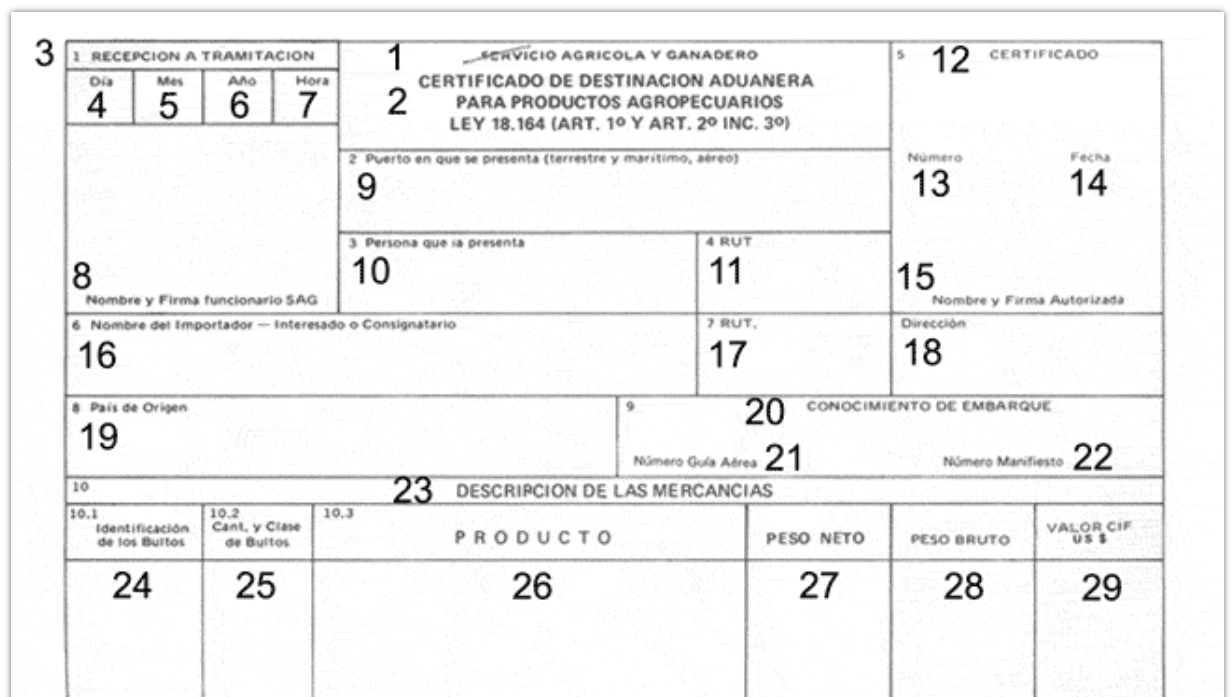 Il certificato deve essere richiesto dall'importatore presso l'ufficio locale competente del Ministero dell'Agricoltura, Servizio Agricolo e Zootecnico = Ministerio de Agricultura, Servicio Agrícola y Ganadero (SAG), Avenida Presidente Bulnes 140, CL-Santiago de Chile, numero di telefono: +56 2 23451100, sito web: https://www.sag.cl.