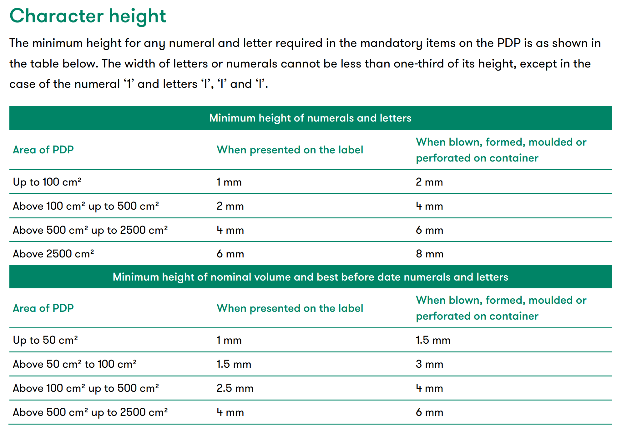 L’altezza minima di stampa delle lettere è di 1 mm (o 2 mm se il testo è inciso o altrimenti posto direttamente sulla confezione).