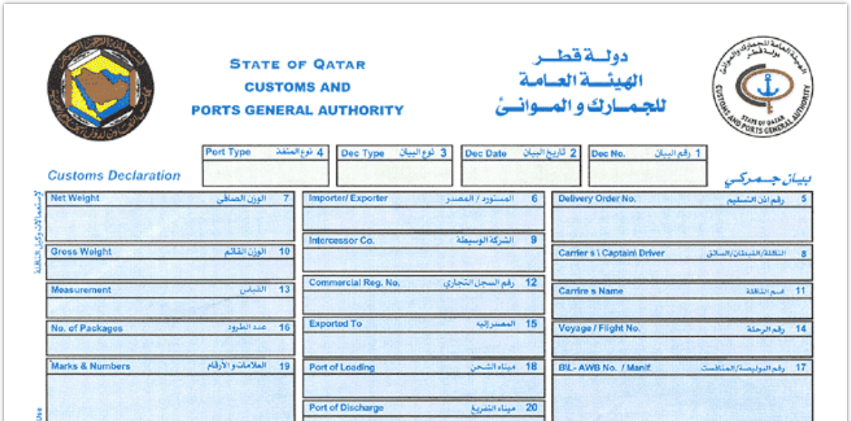 La compilazione è a carico dell’importatore e può essere effettuata in lingua araba o inglese. L’autorità competente per la ricezione e gestione della dichiarazione è la General Authority of Customs, Customs Affairs Department (P.O. Box 81, QA-Doha; telefono: +974 44457457; fax: +974 44457247.