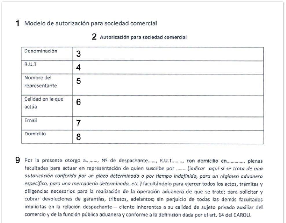 L’autorizzazione deve essere predisposta dall’importatore in favore dell’agente doganale, redatta in lingua spagnola e conforme al modello prestabilito. Una volta predisposta, deve essere presentata dallo stesso agente doganale alla Dirección Nacional de Aduanas (DNA), con sede in Rambla 25 de Agosto 199, Montevideo (UY).