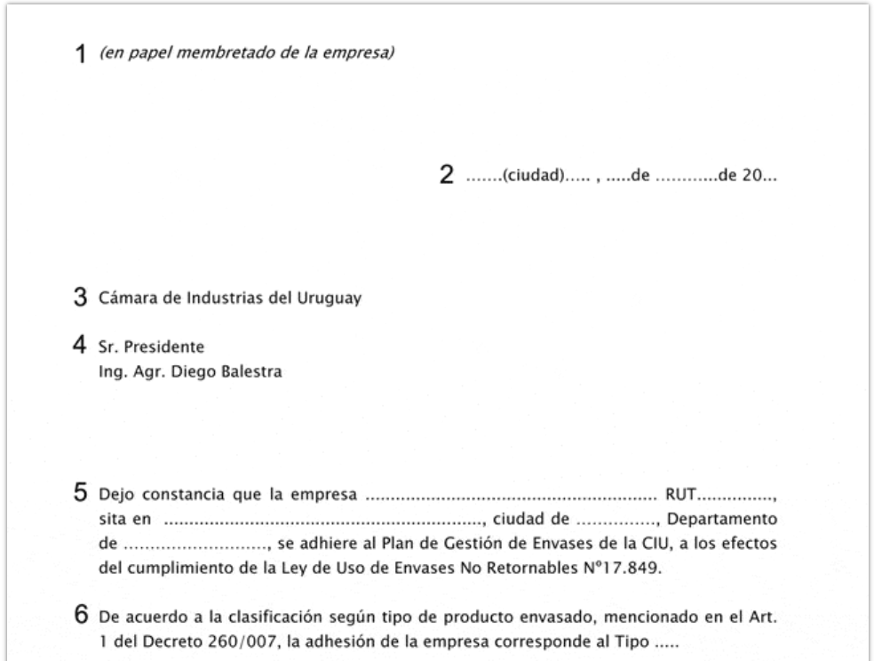 Non è previsto un modulo cartaceo obbligatorio. La domanda deve essere compilata in lingua spagnola e presentata online attraverso il Sistema de Gestión de Envases y Residuos de Envases della DINACEA. Per poter utilizzare il sistema, è necessario effettuare una registrazione preliminare.