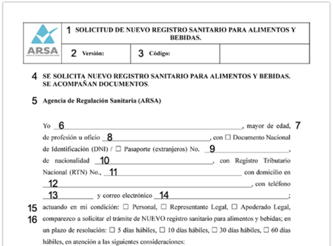 La registrazione deve essere richiesta dall'importatore o dal suo rappresentante autorizzato presso uno degli uffici dell'Agenzia di regolamentazione sanitaria (Agencia de Regulación Sanitaria - ARSA): a Tegucigalpa: Calle de los Alcaldes, Antiguo Local de Migración, frente al City Mall "Tegucigalpa", Comyagüela M.D.C., HN-Tegucigalpa;