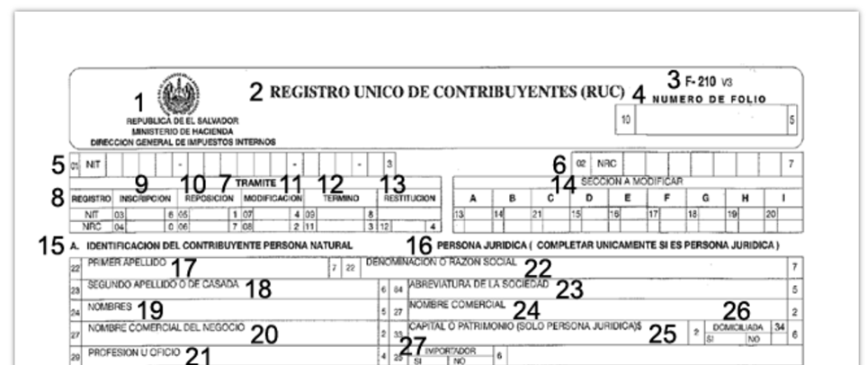 La registrazione deve essere richiesta dall'importatore o dal suo rappresentante presso il Ministero delle Finanze, Direzione Generale delle Imposte Interne, Centro Servizi per i Contribuenti = Ministerio de Hacienda, Dirección General de Impuestos Internos (DGII), Centro de Servicios al Contribuyente, Diagonal Centroamérica y Avenida Alvarado No. 4, Ex Bolerama Jardín, SV-San Salvador, numeri di telefono: +503 22373000, 22443000, 22443444, 22443871, numero di fax: +503 22447201.