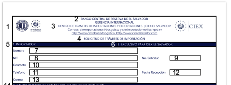 Il permesso deve essere richiesto dall'importatore o dal suo rappresentante legale presso la Banca Centrale di Riserva, Centro di Smistamento Importazioni ed Esportazioni = Banco Central de Reserva (BCR), Centro de Trámites de Importaciones y Exportaciones (CIEX), Alameda Juan Pablo II, entre 15 y 17 Avenida Norte, Apartado Postal 106, SV-San Salvador, numero di telefono: +503 22818000, numero di fax: +503 22818086, sito web: https://www.ciexelsalvador.gob.sv, oppure per via elettronica.