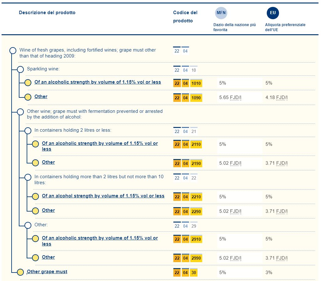 I vini e le bevande alcoliche dell’UE esportate nelle Isole Fiji godono di un’imposizione di dazio pari al 5%, come da tabella riportata di seguito. L’apertura dell’87% delle importazioni dall’UE, verso il mercato interno delle Fiji, si concluderà nell'arco dei prossimi 15 anni.