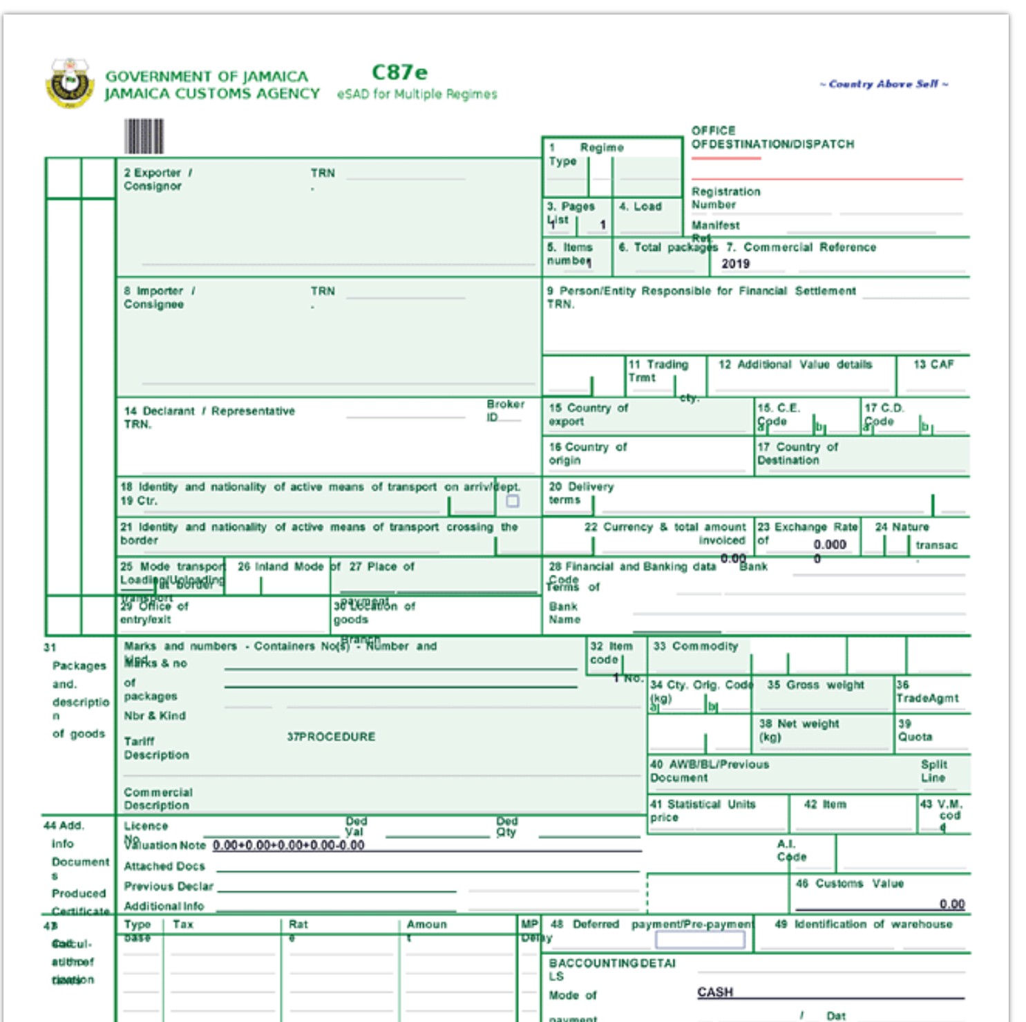 Richiesto per lo sdoganamento di merci con un valore pari o superiore a 5.000 USD o all'equivalente in valuta giamaicana.