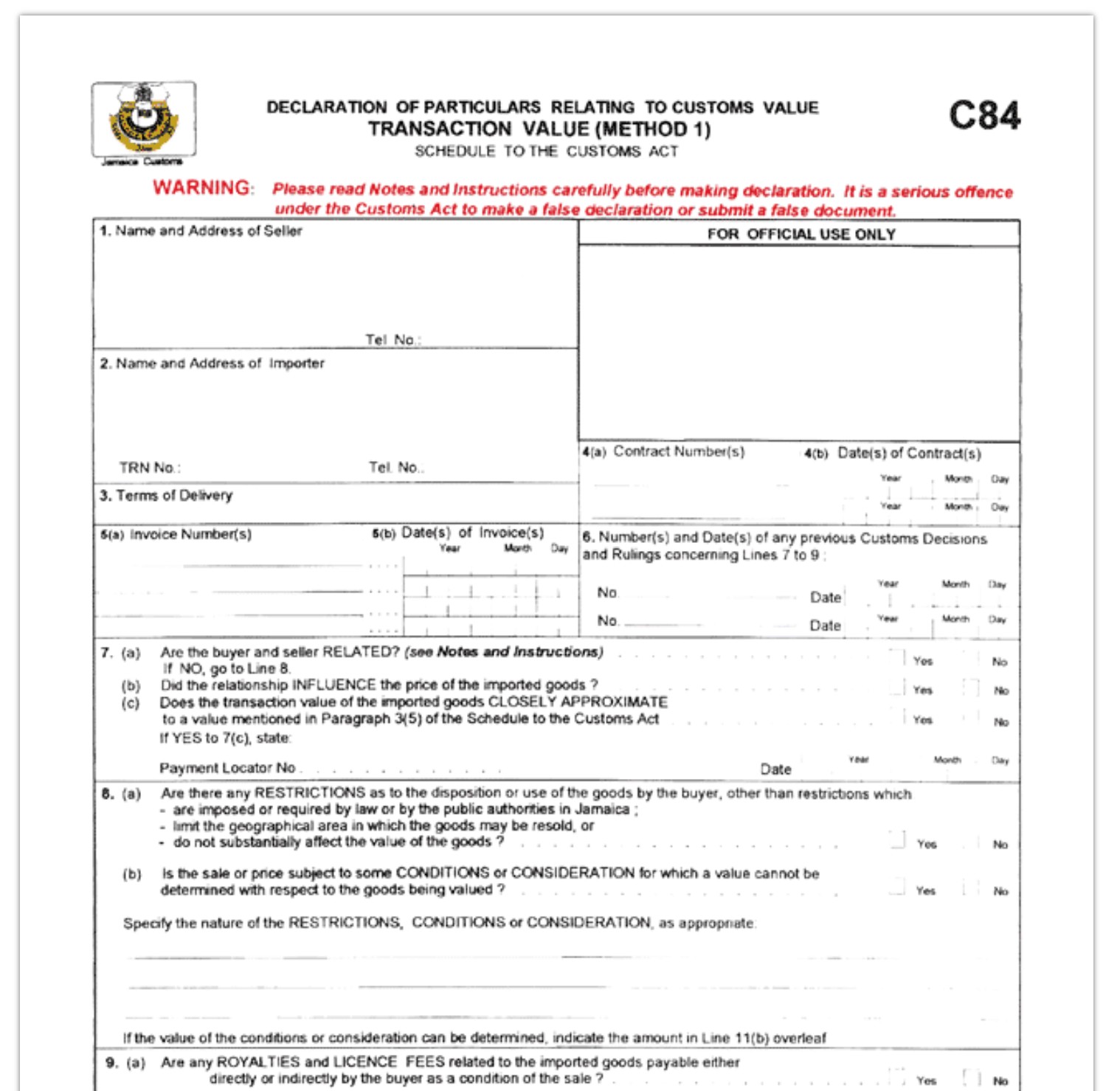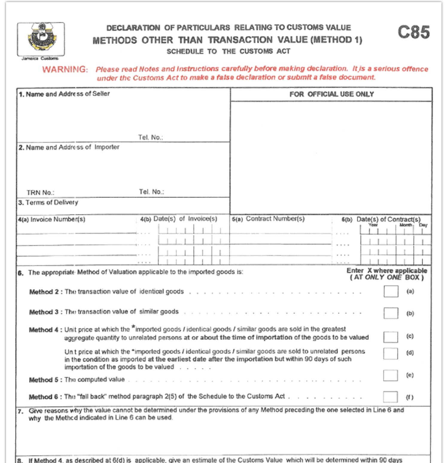 Per il metodo del valore della transazione, il modulo C84 (vedi sotto) deve essere compilato dall'importatore in inglese. Se si applica un metodo di valutazione diverso da quello basato sul valore della transazione, occorre utilizzare il modulo C85 (vedi sotto).