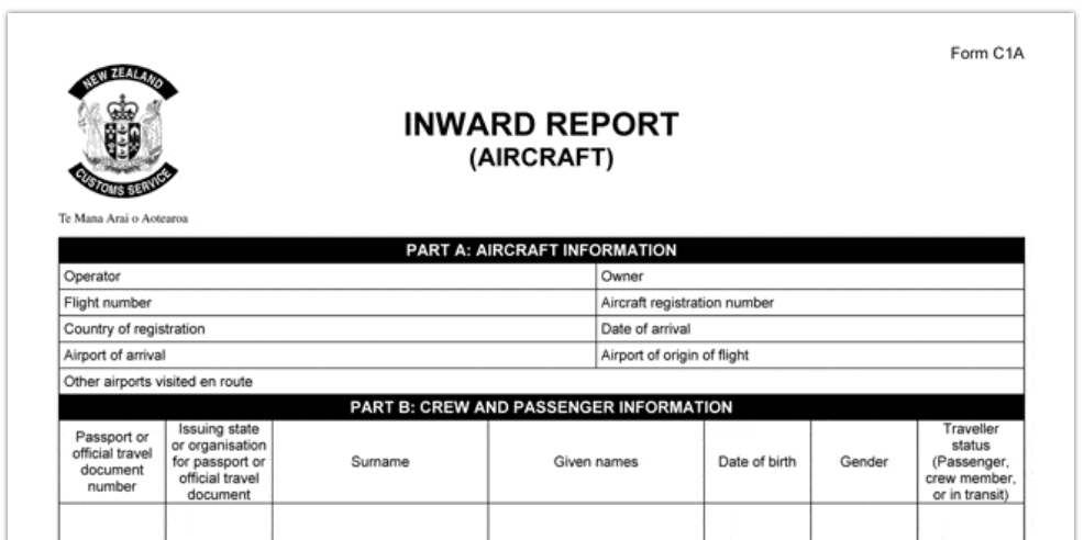 Documento che fornisce alle autorità doganali neozelandesi i dettagli relativi a un aeromobile.