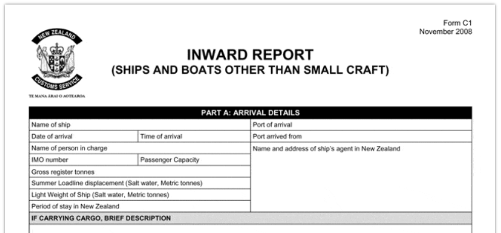 Documento che fornisce alle autorità neozelandesi informazioni sull'arrivo di navi commerciali.